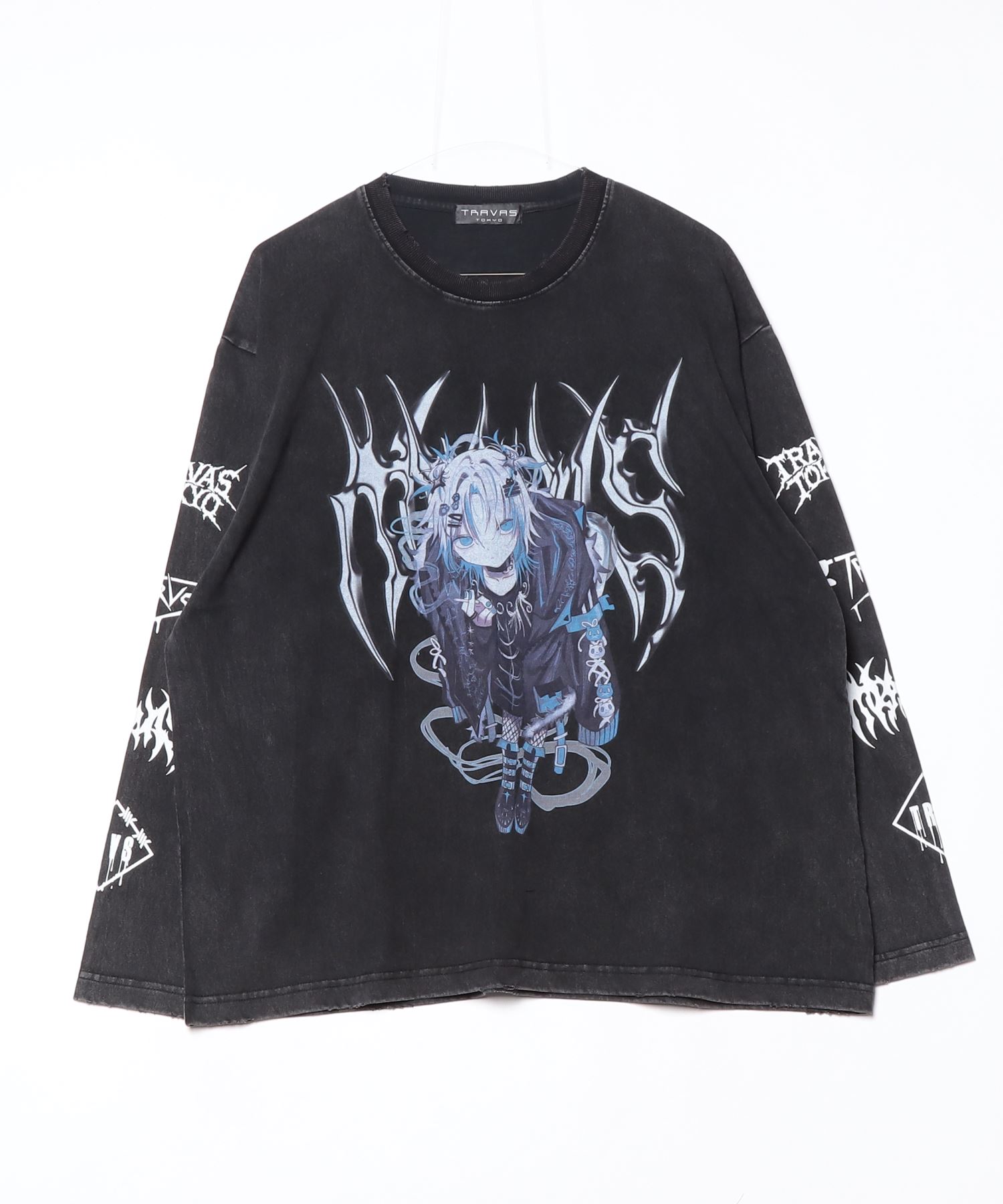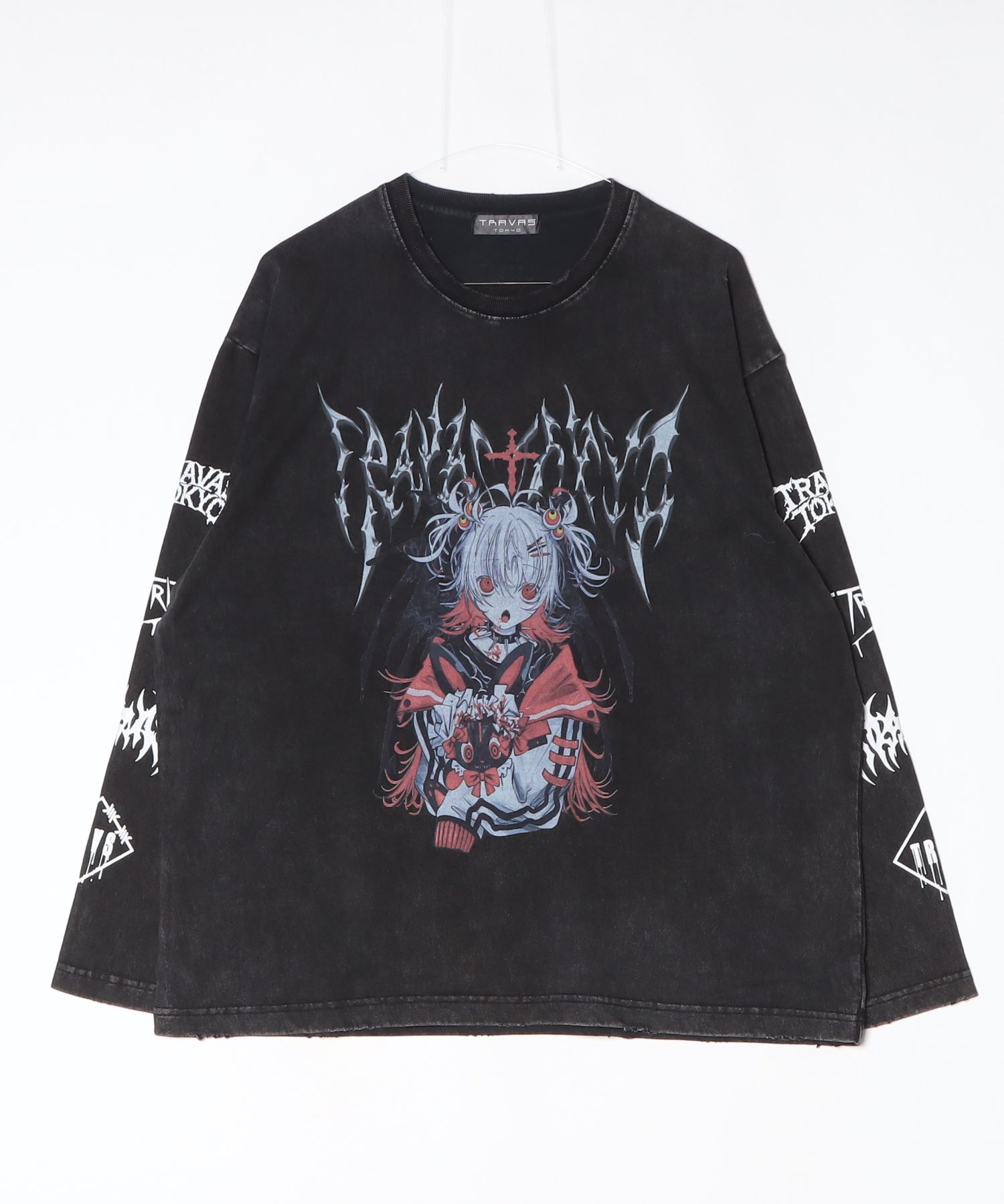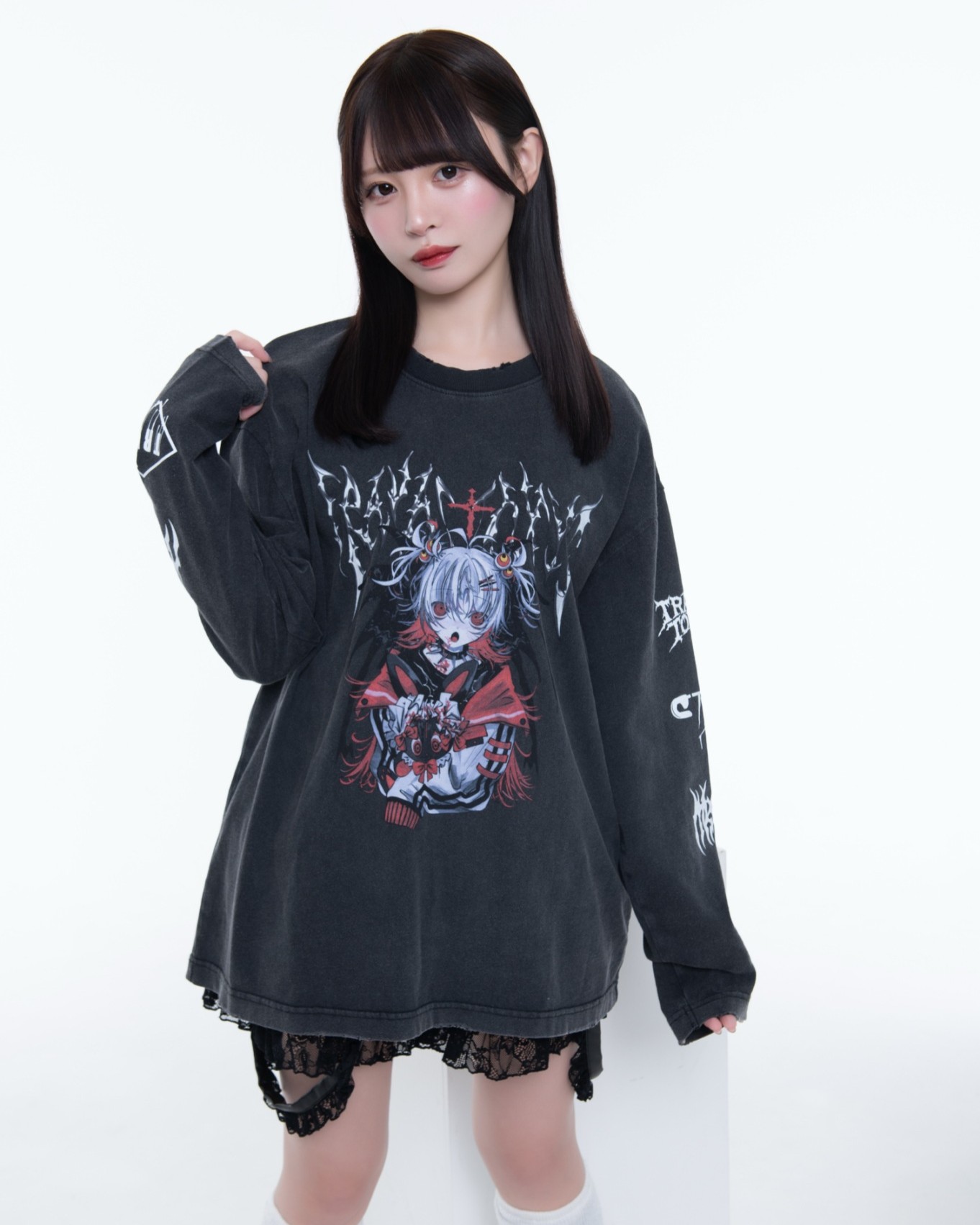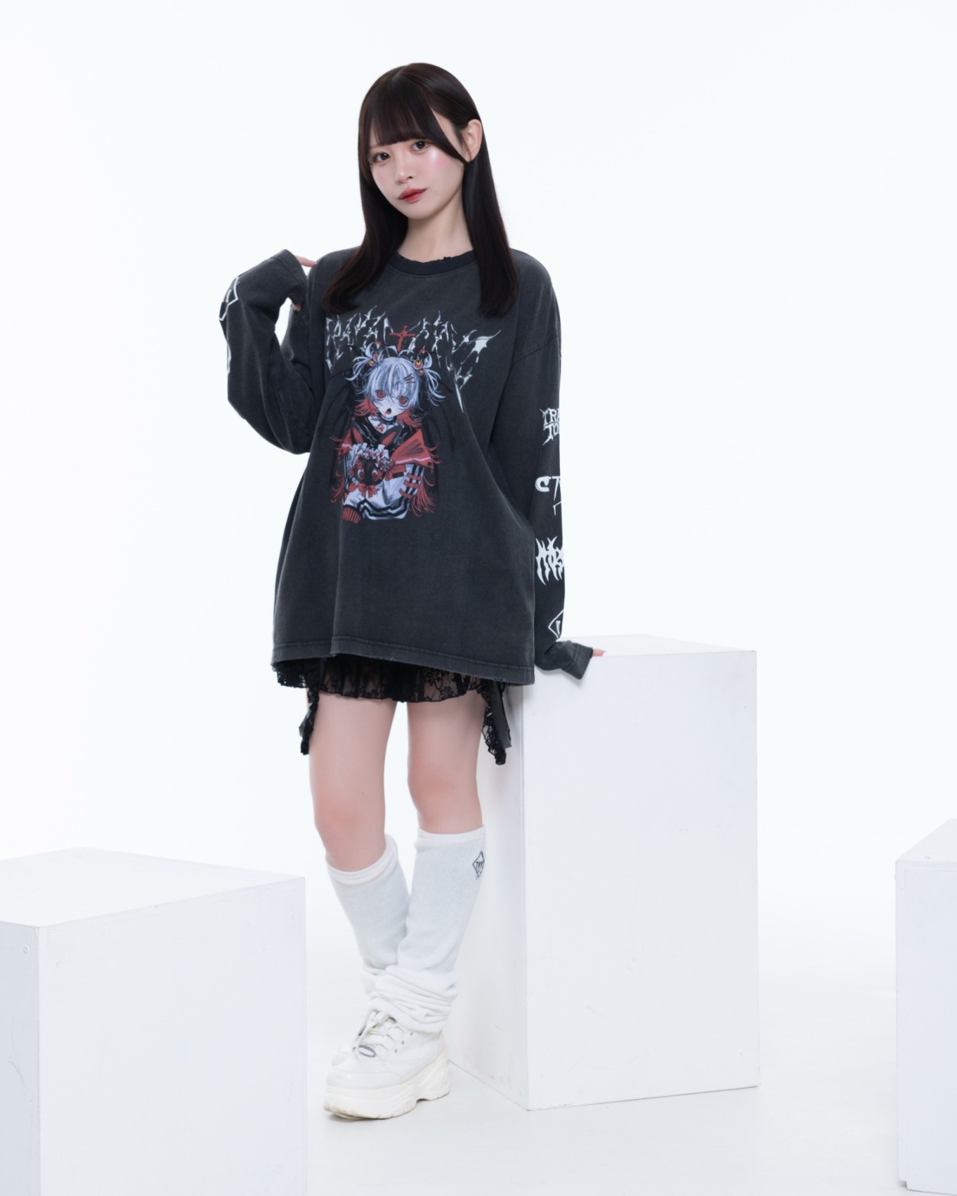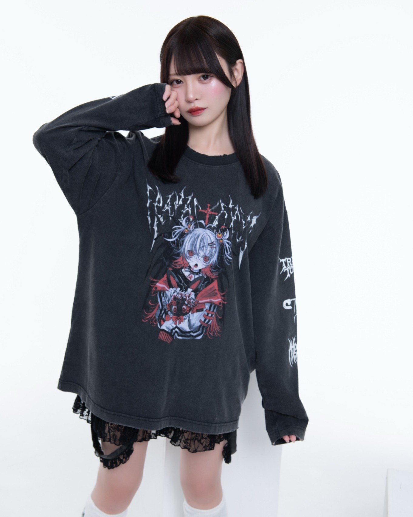 A long-sleeve T-shirt featuring a band T-shirt-style logo and an eye-catching girl print.