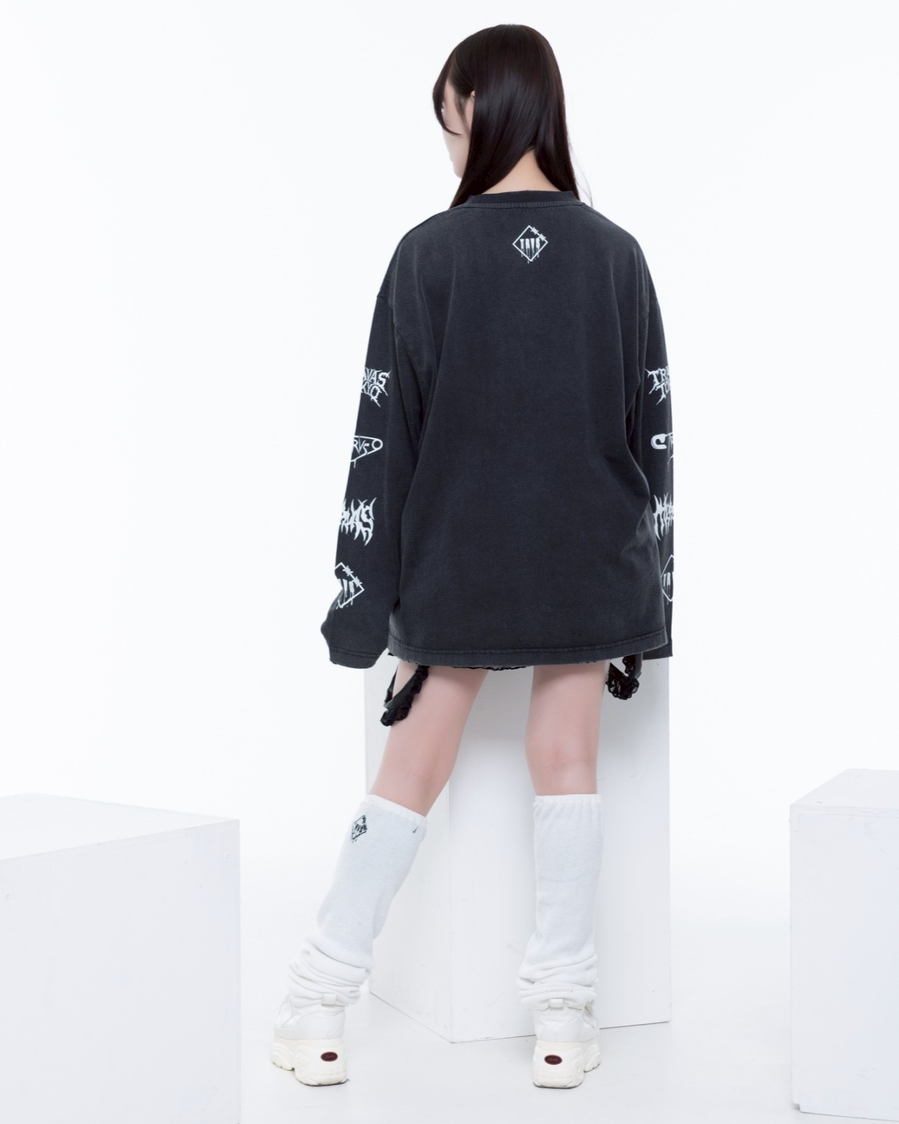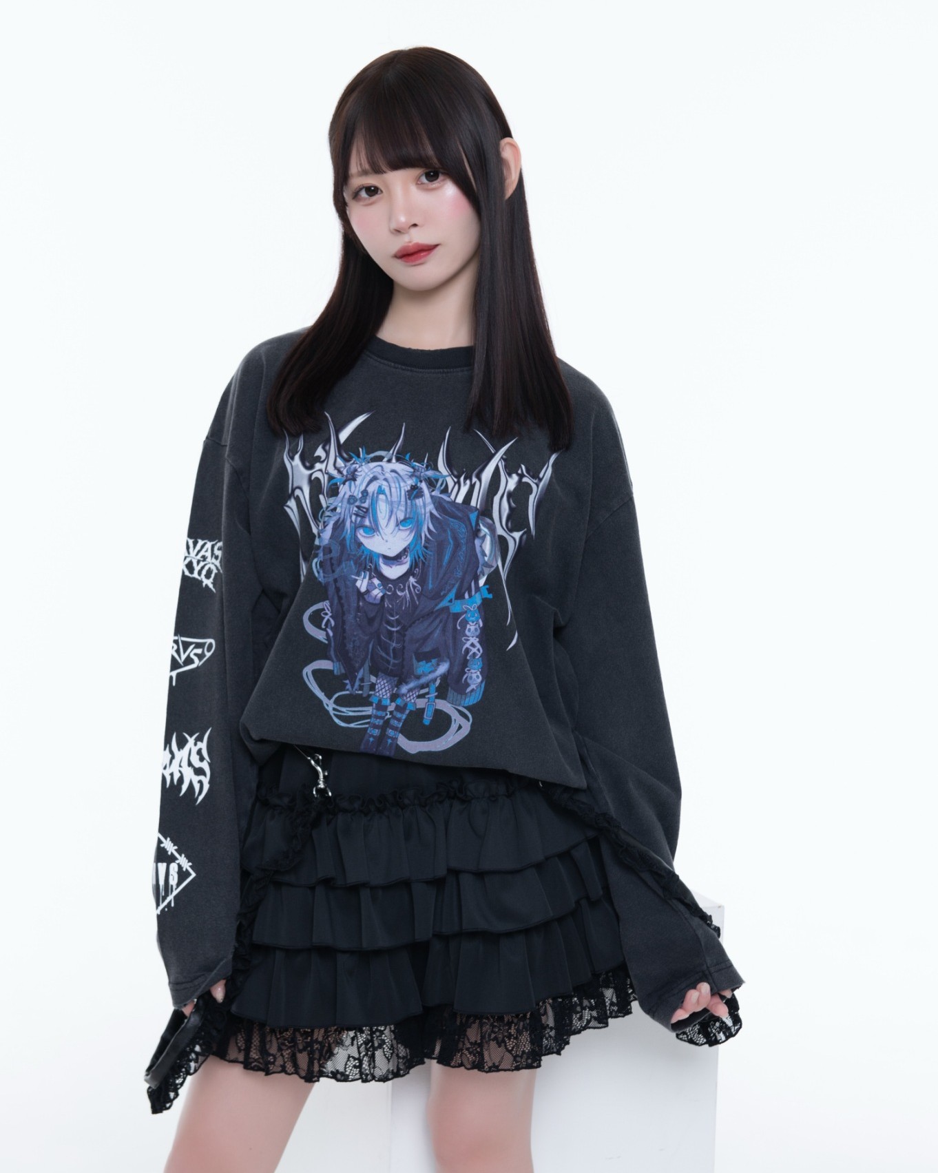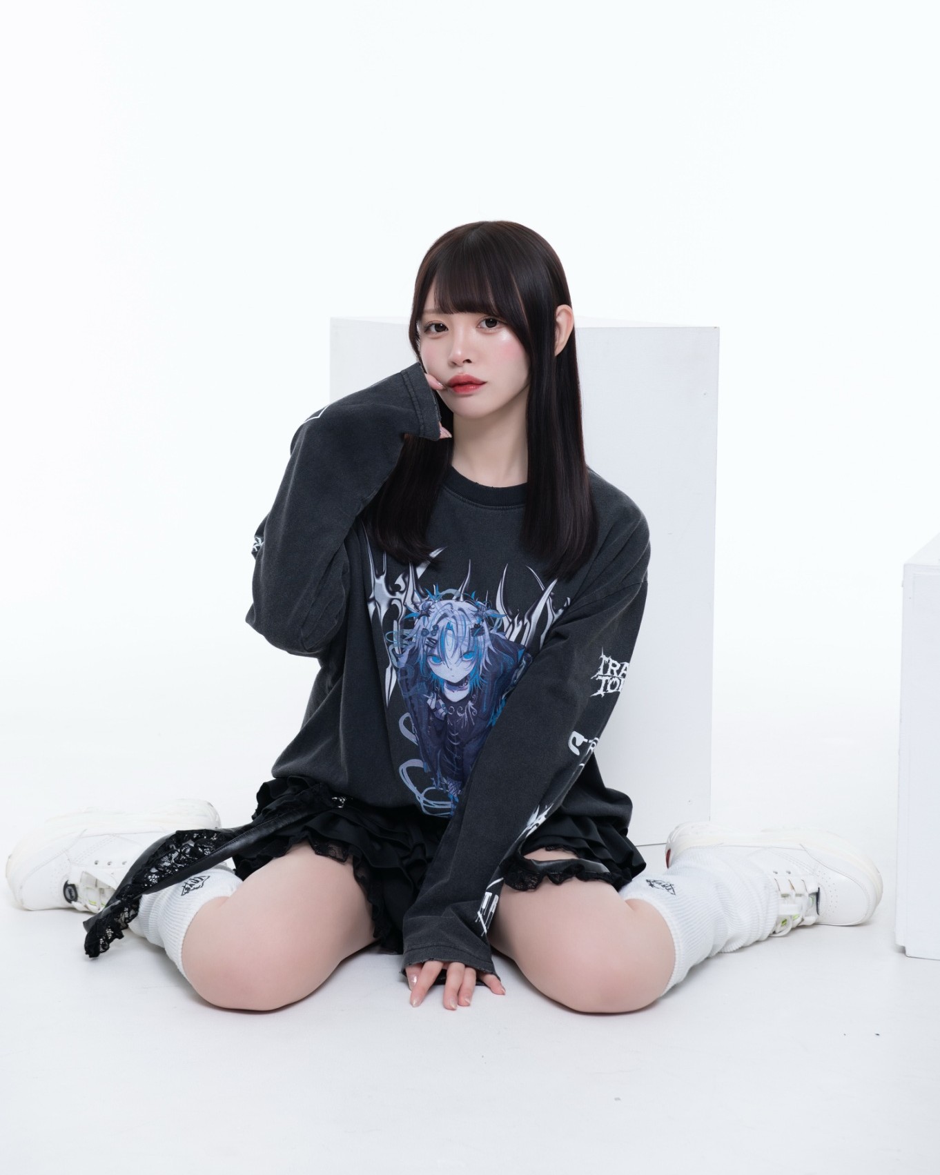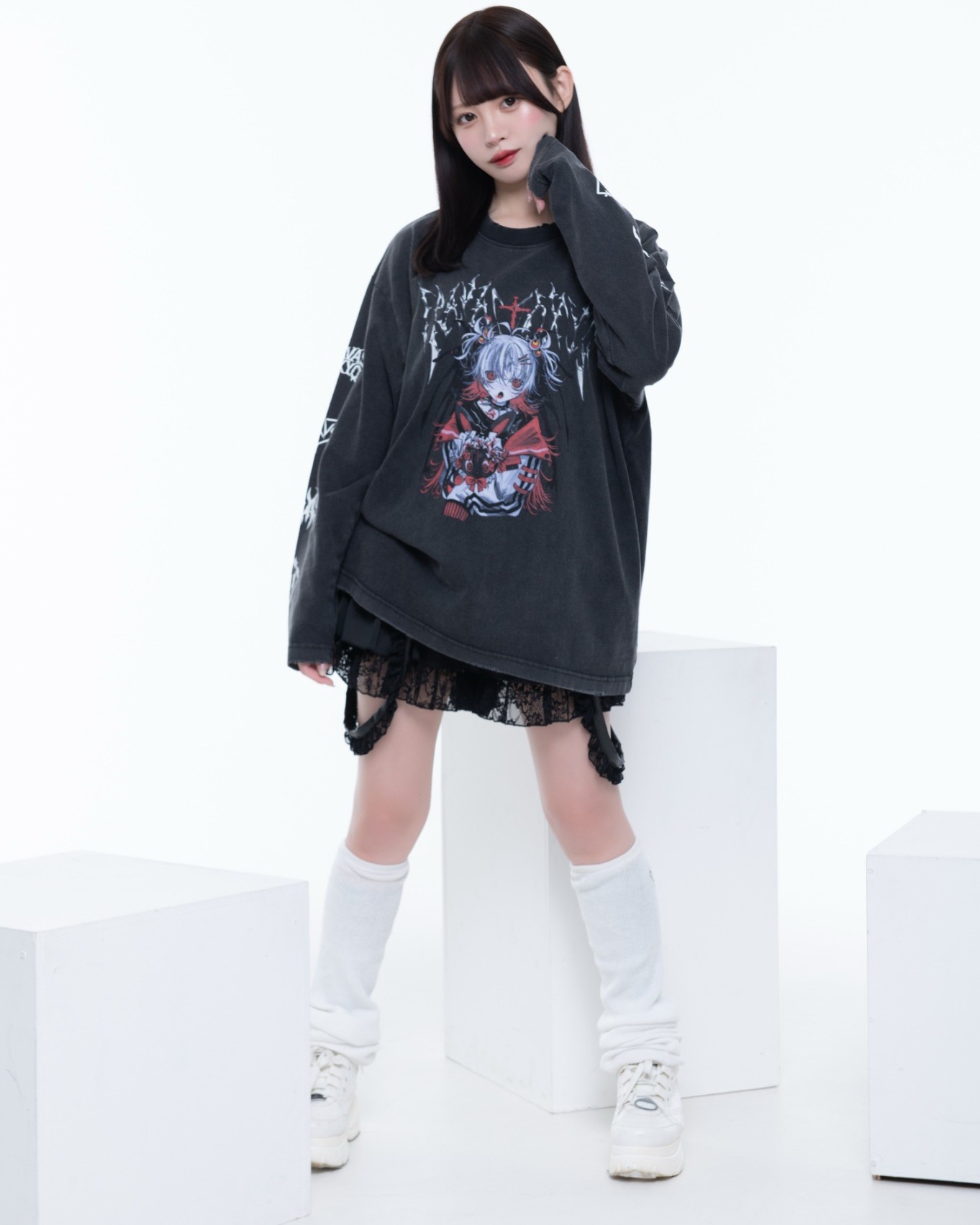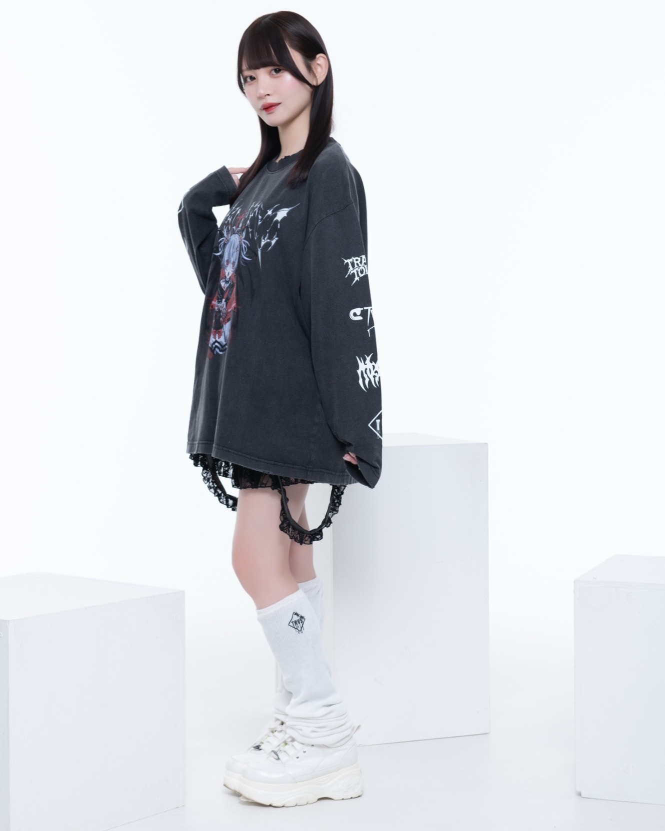 A long-sleeve T-shirt featuring a band T-shirt-style logo and an eye-catching girl print.