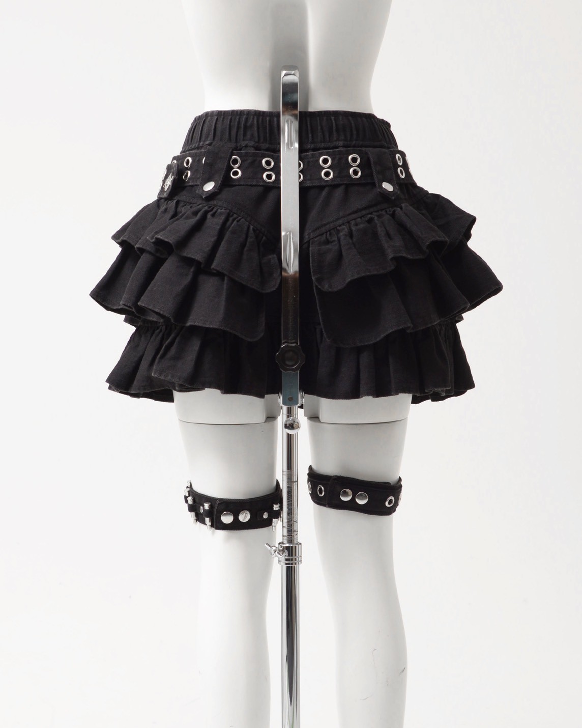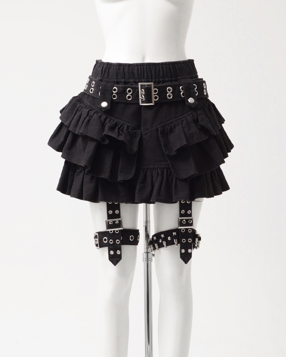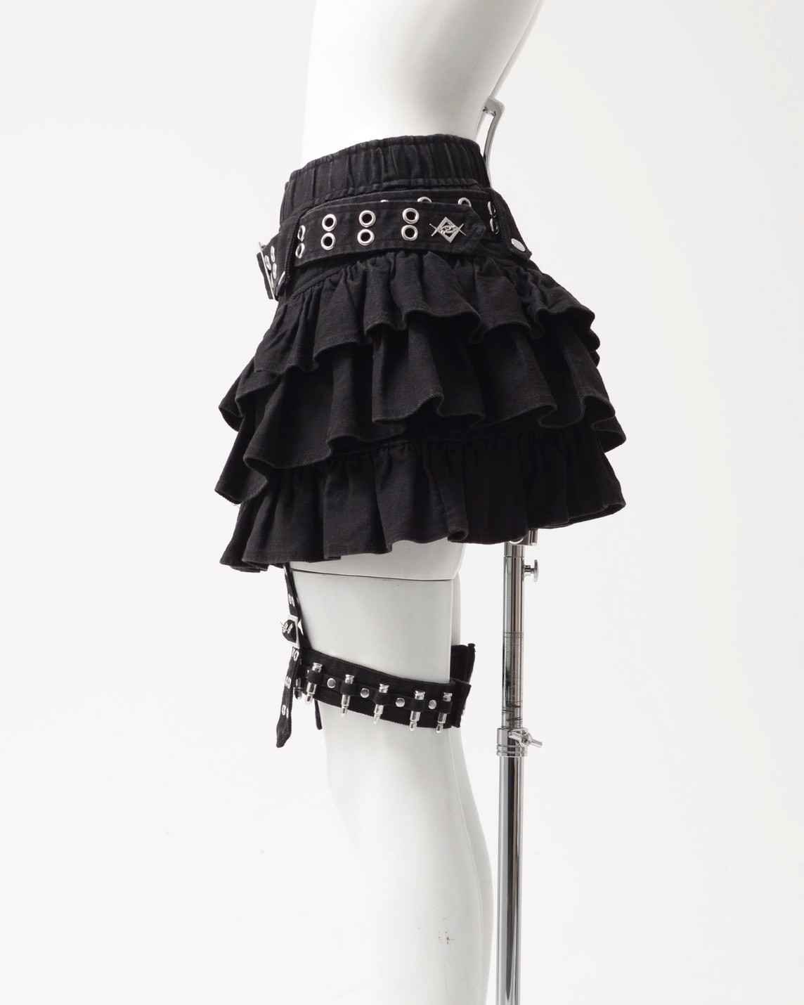 ■ Right-leg garter belt features eyelets and a buckle; left-leg garter belt has a design with inserted bullet parts.