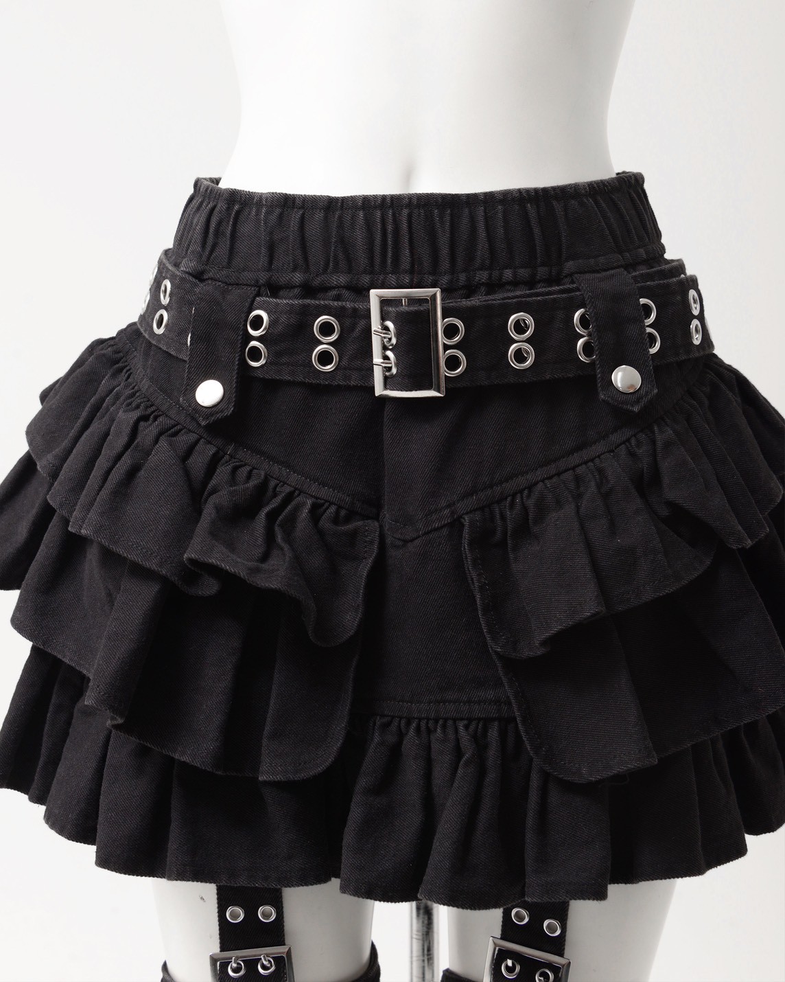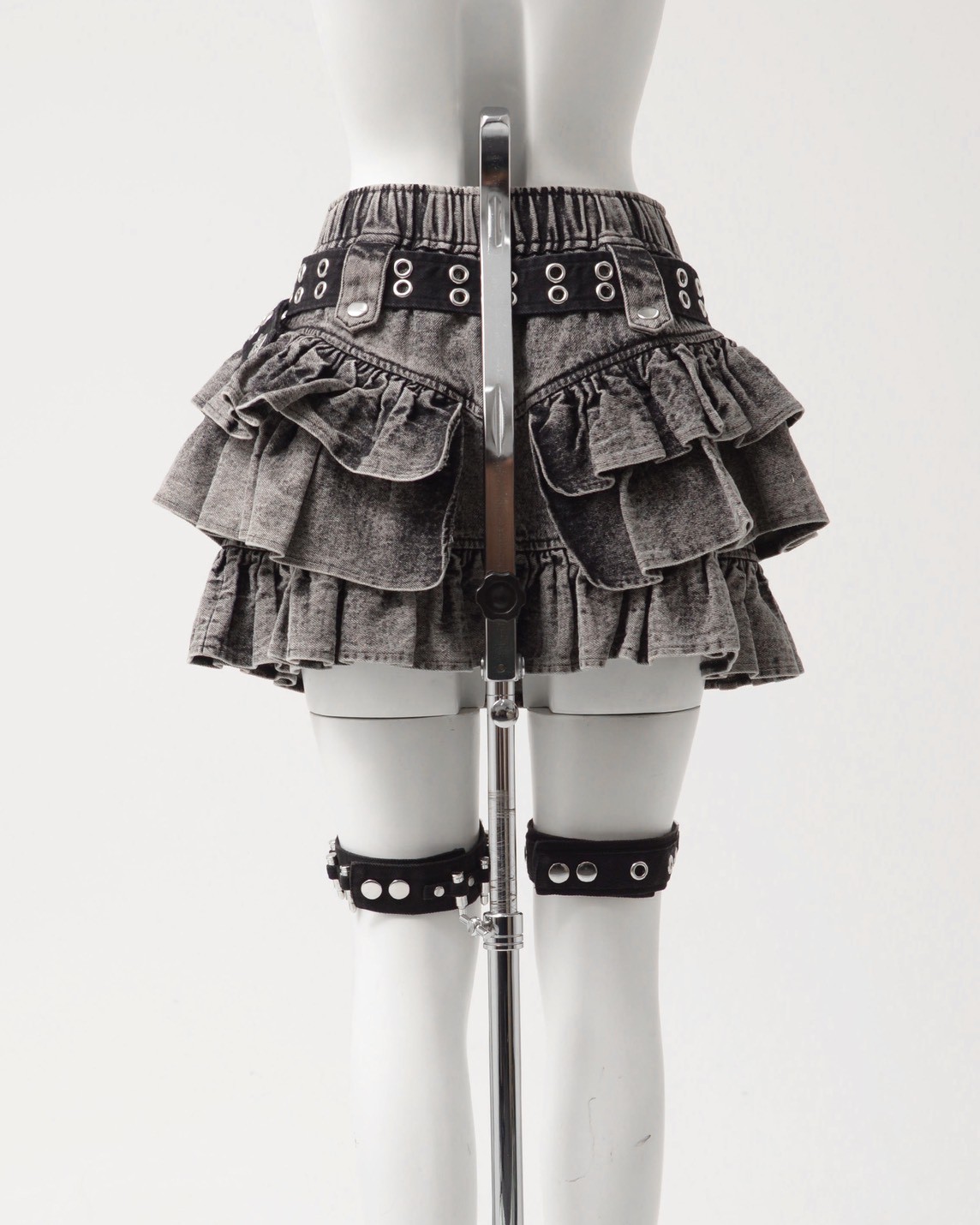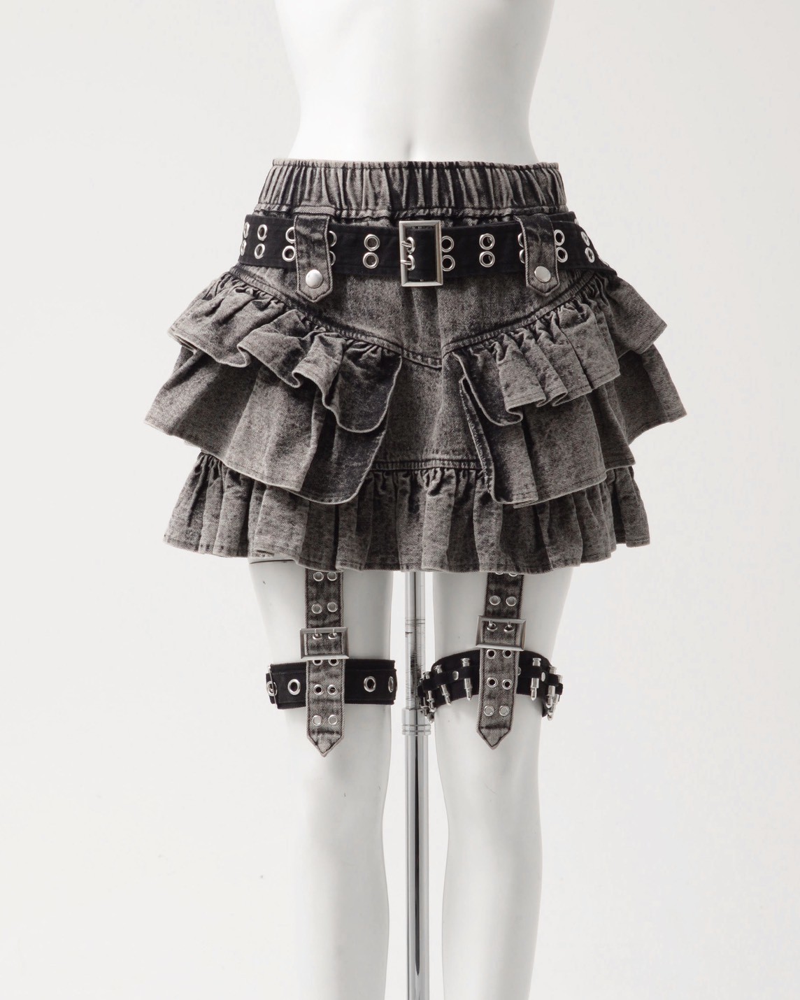 ■ Right-leg garter belt features eyelets and a buckle; left-leg garter belt has a design with inserted bullet parts.