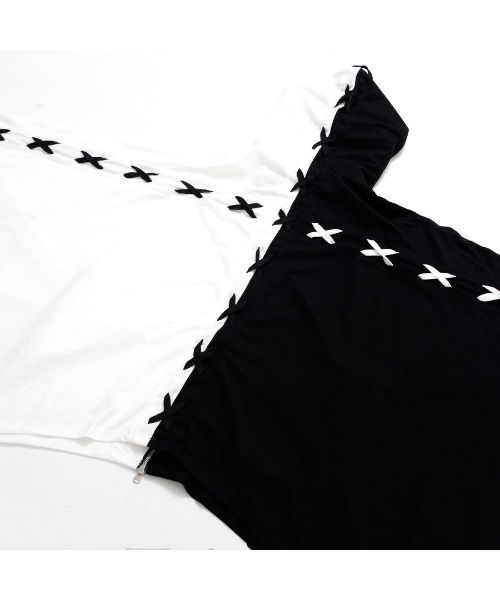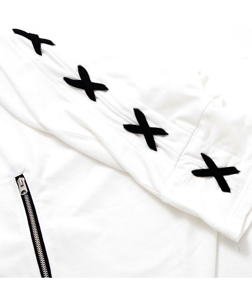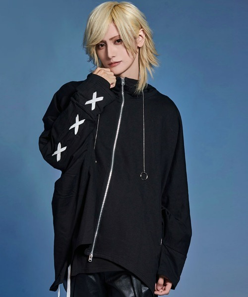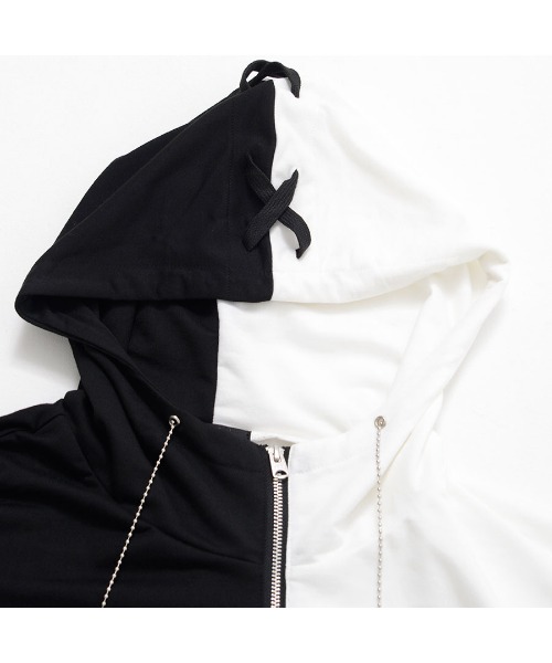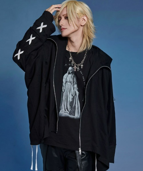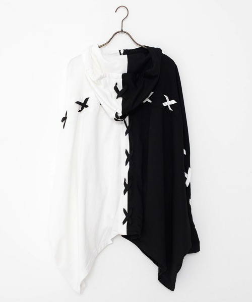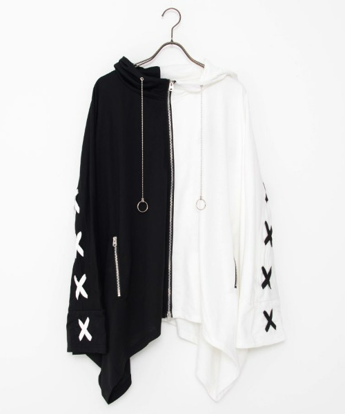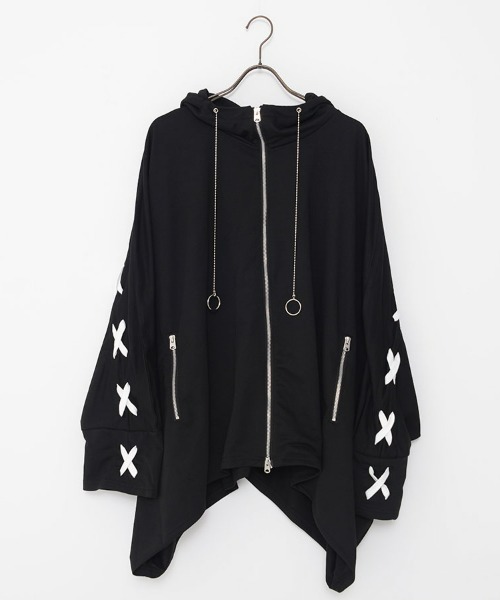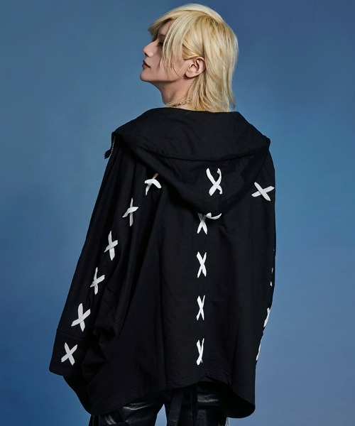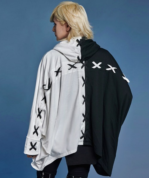 This is a high-neck poncho hoodie featuring a lace-up design arranged in a cross pattern on the back.