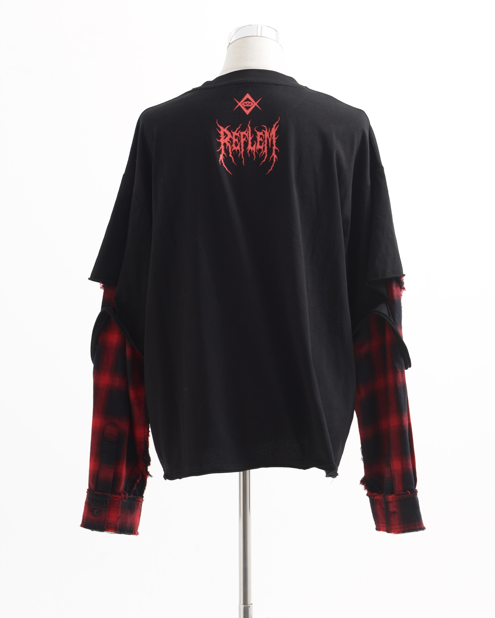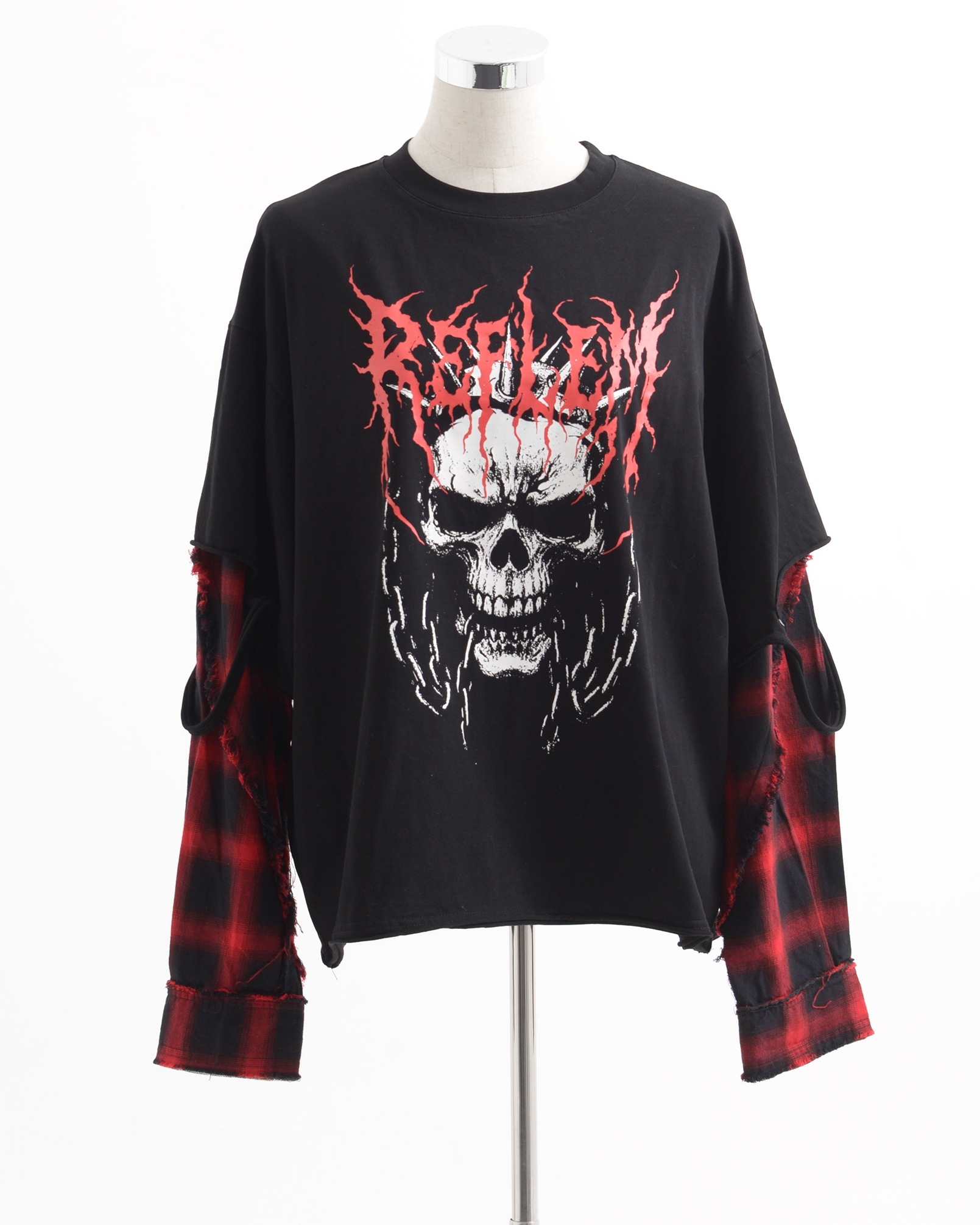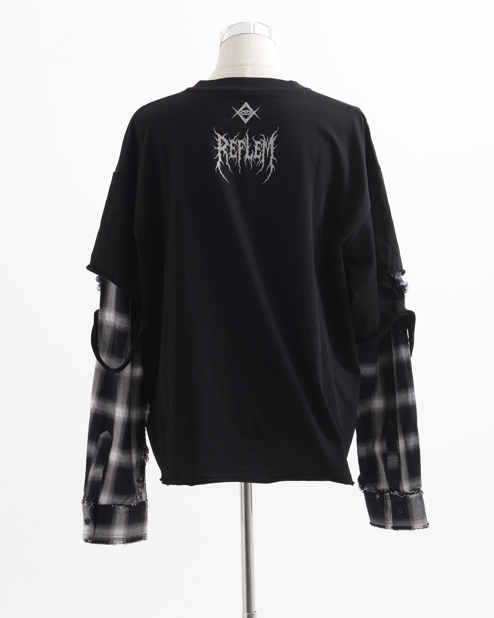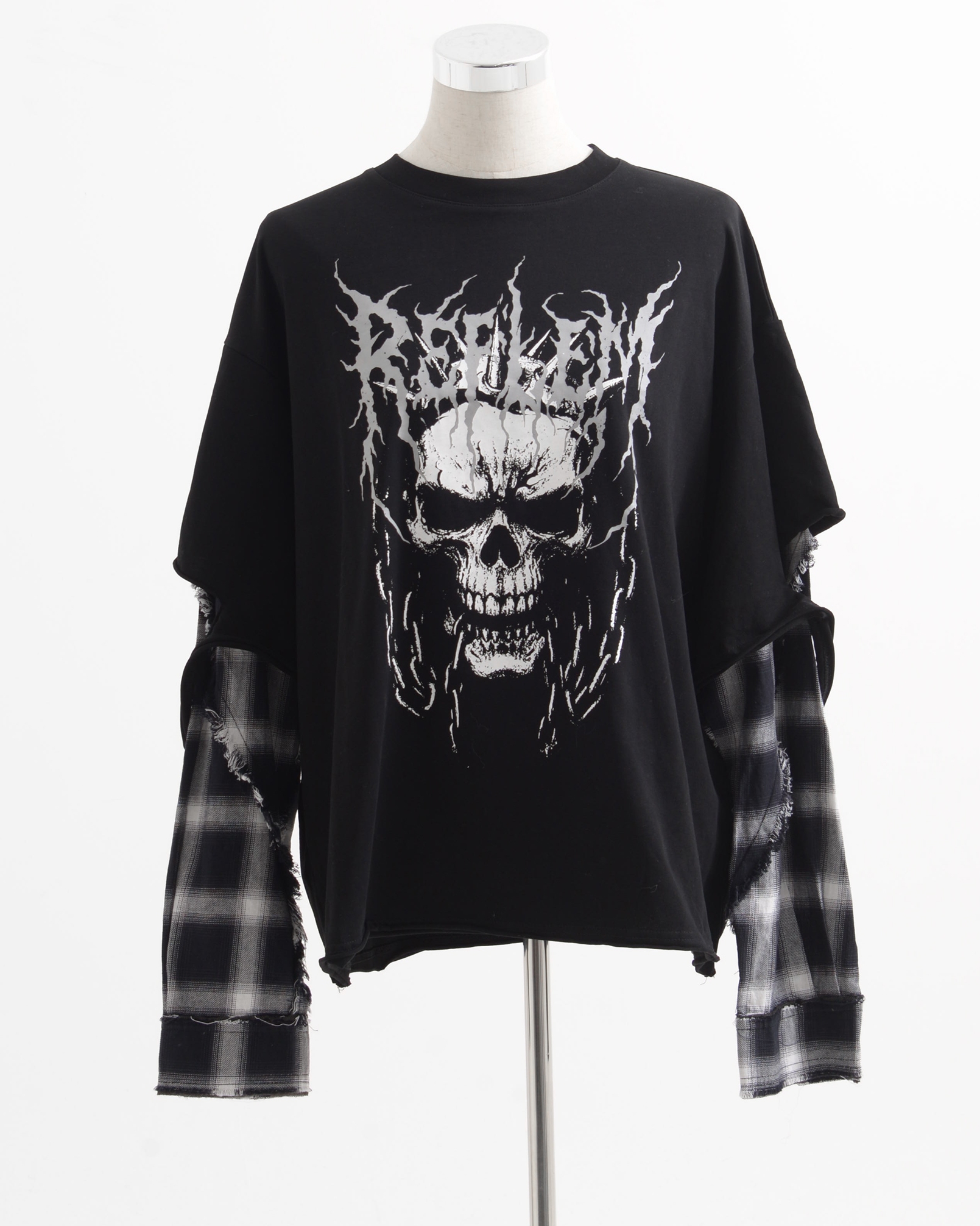 A piece that channels REFLEM’s signature dark street style, featuring a strong punk aesthetic with skull artwork and layered check patterns.