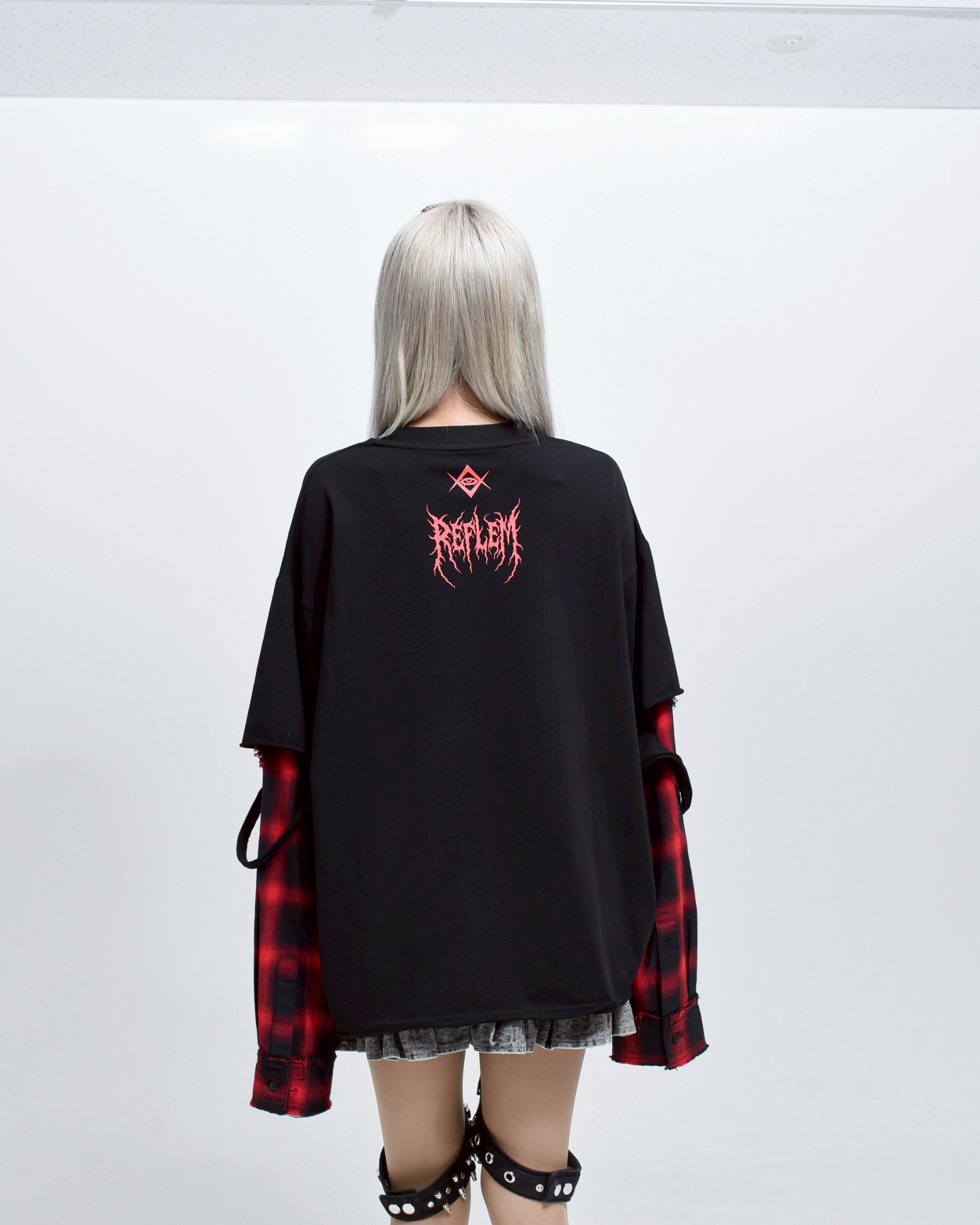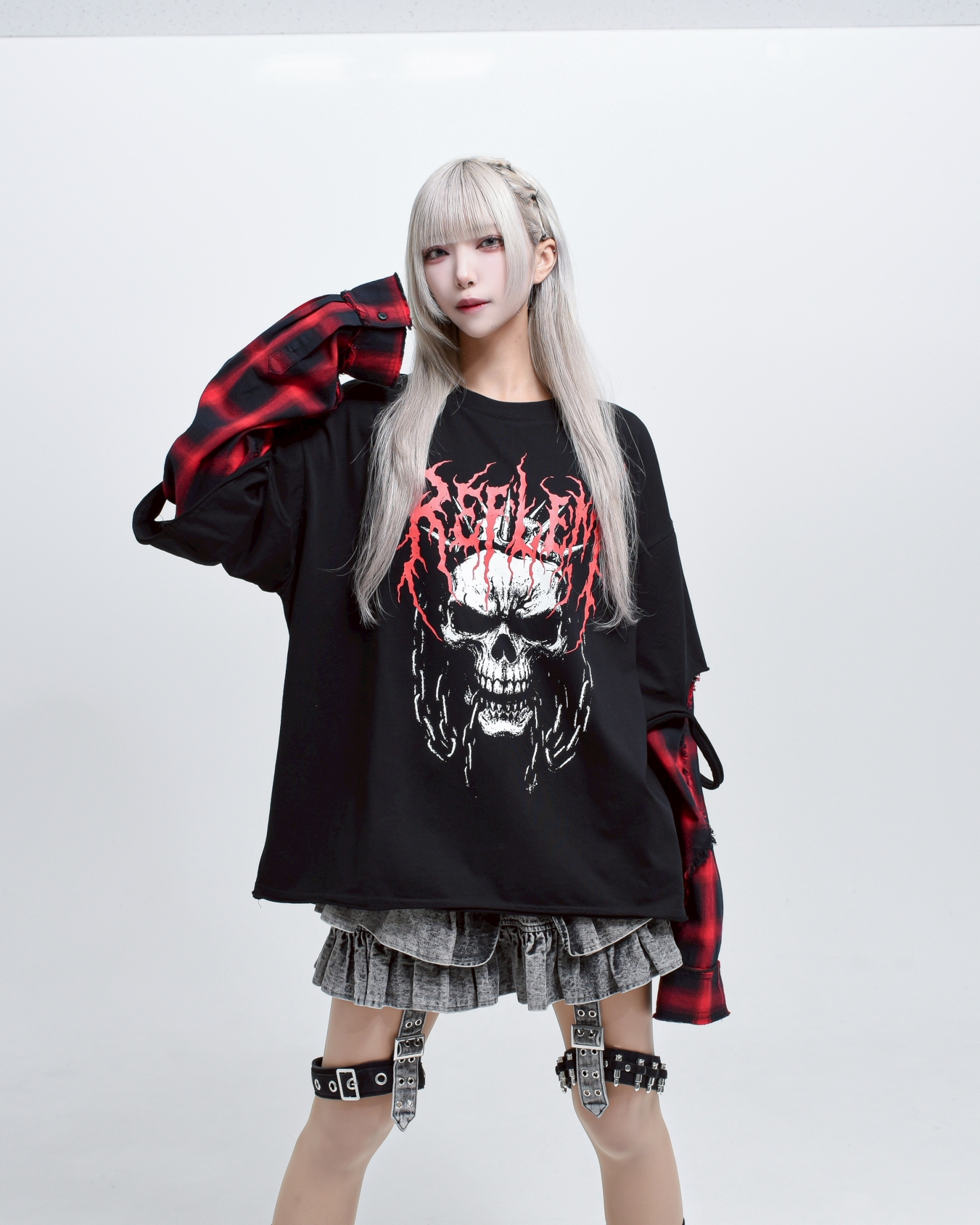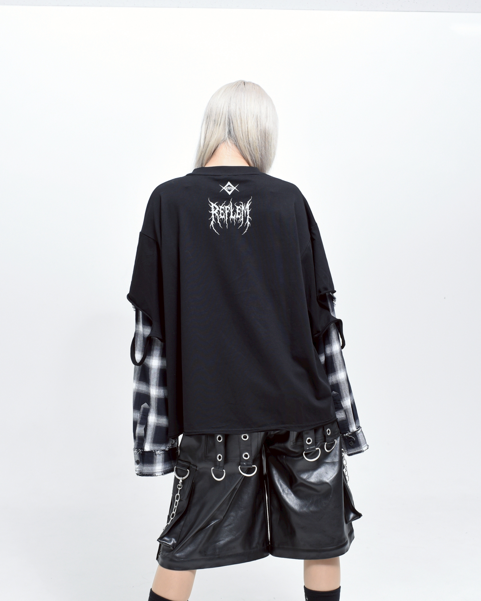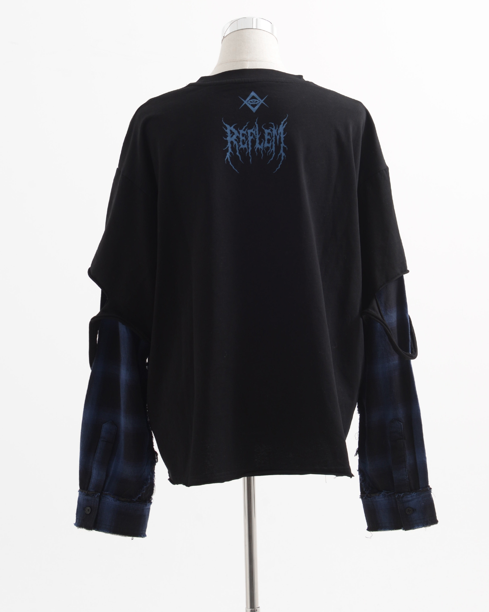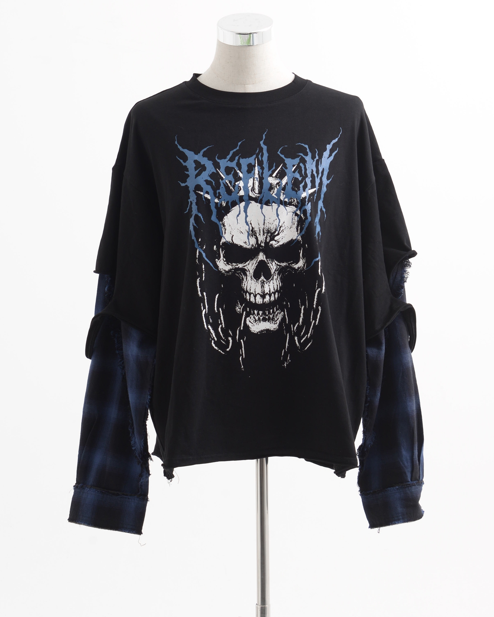 A piece that channels REFLEM’s signature dark street style, featuring a strong punk aesthetic with skull artwork and layered check patterns.