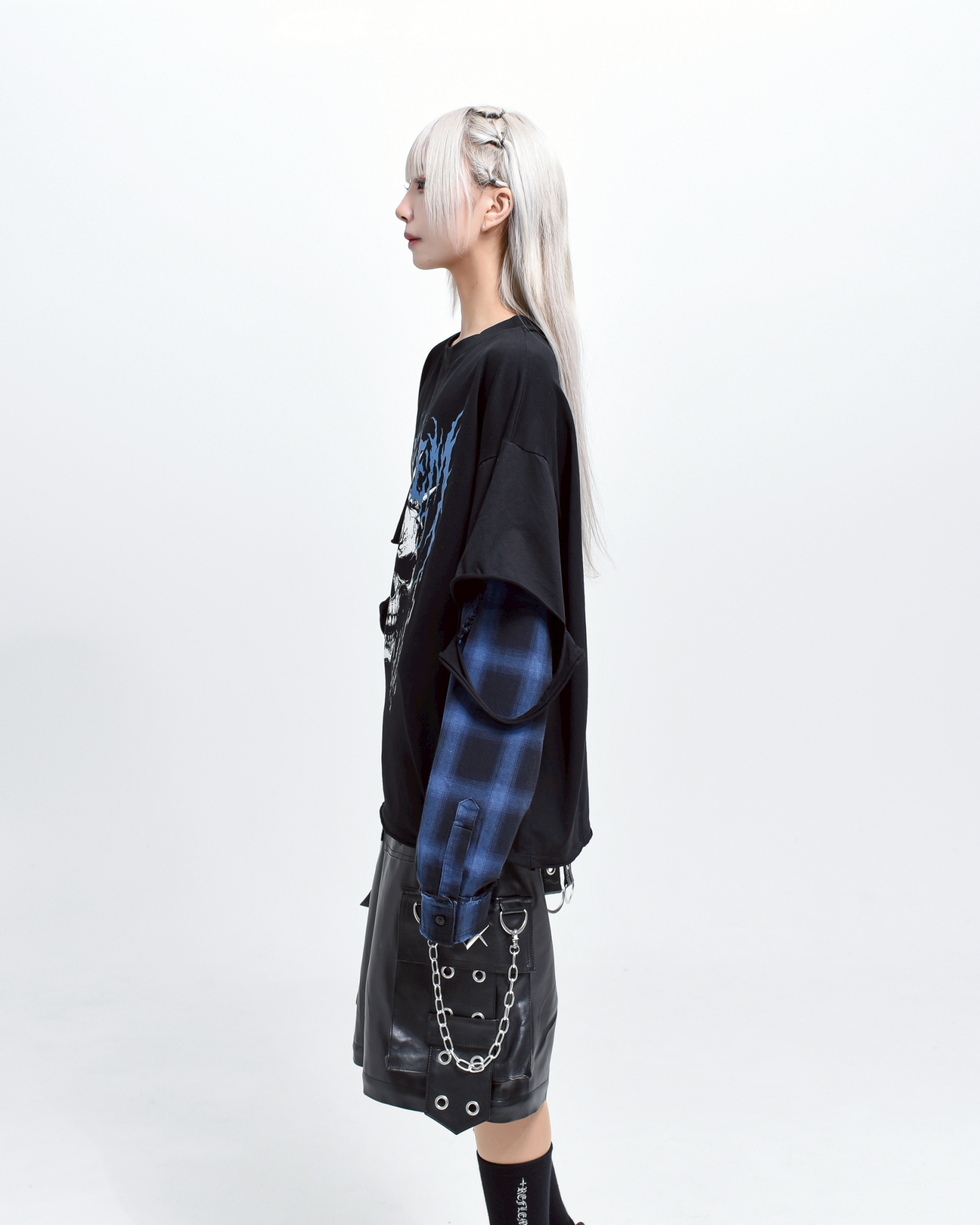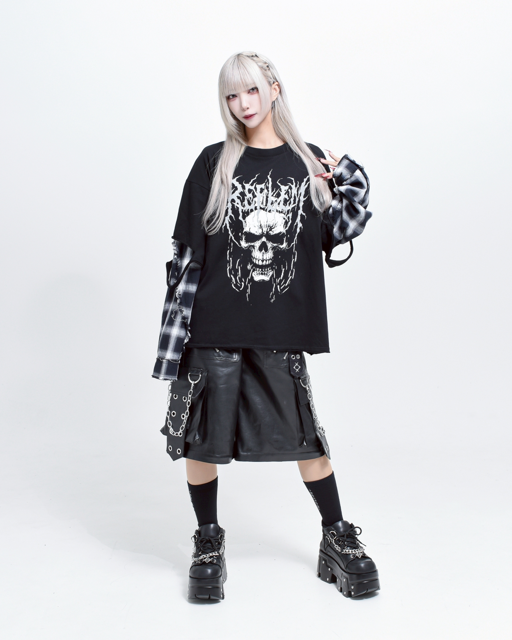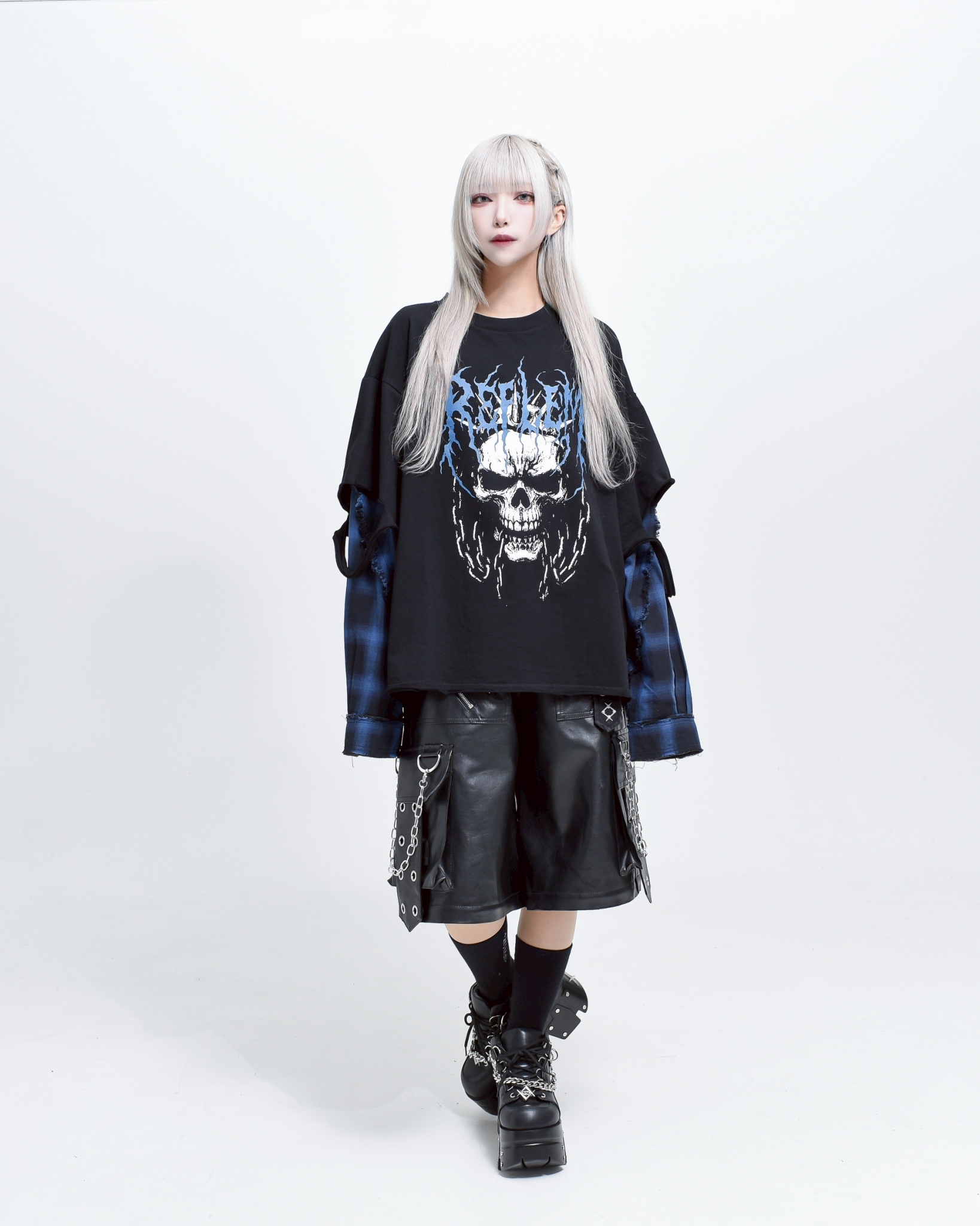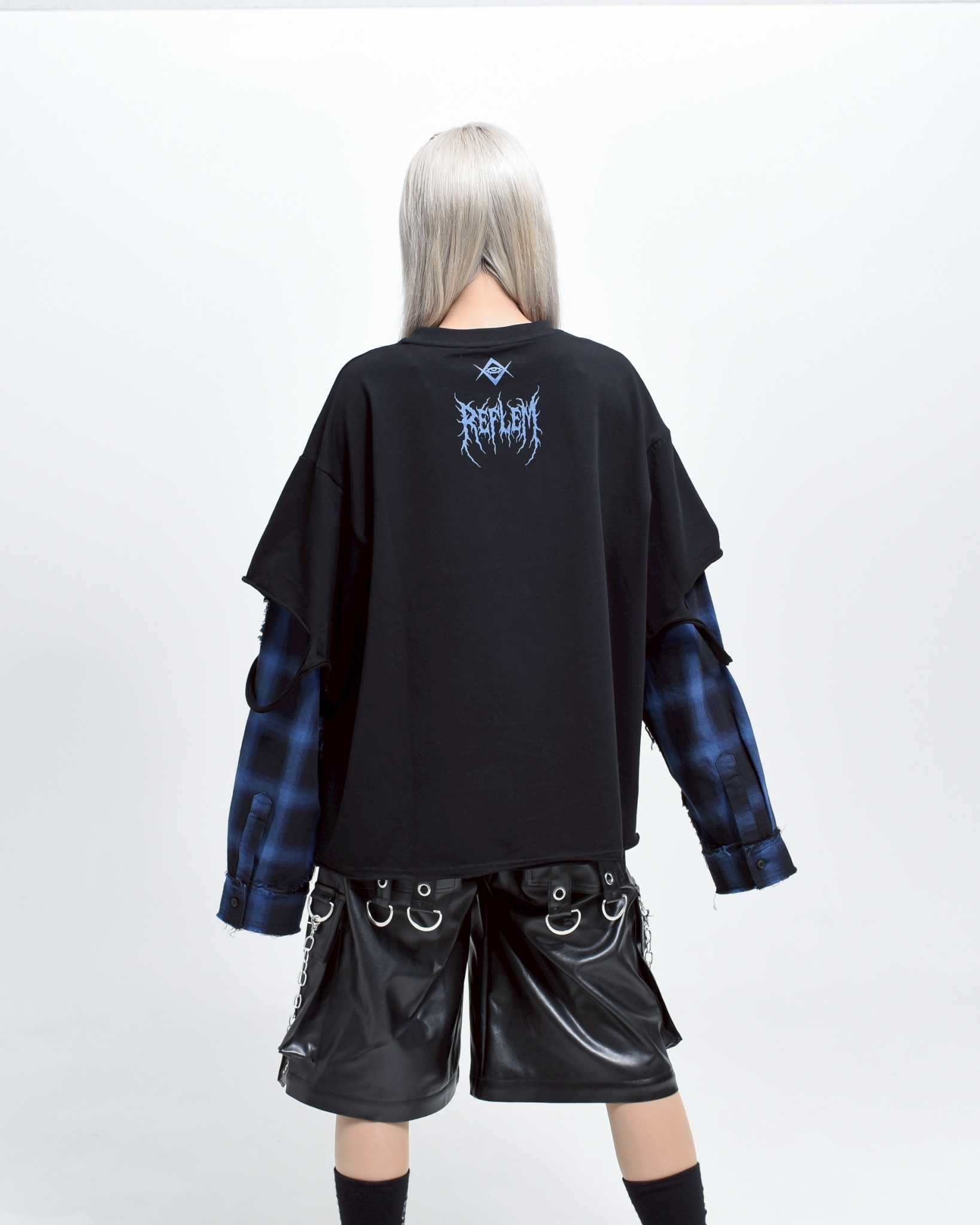 A piece that channels REFLEM’s signature dark street style, featuring a strong punk aesthetic with skull artwork and layered check patterns.