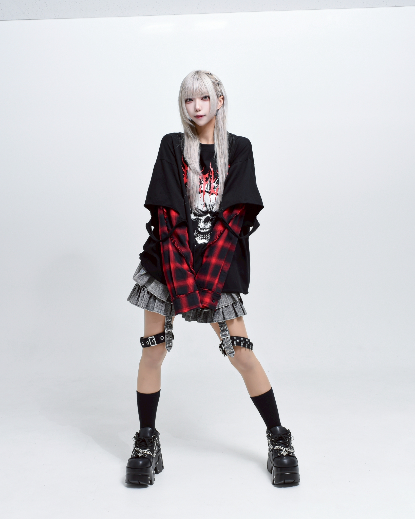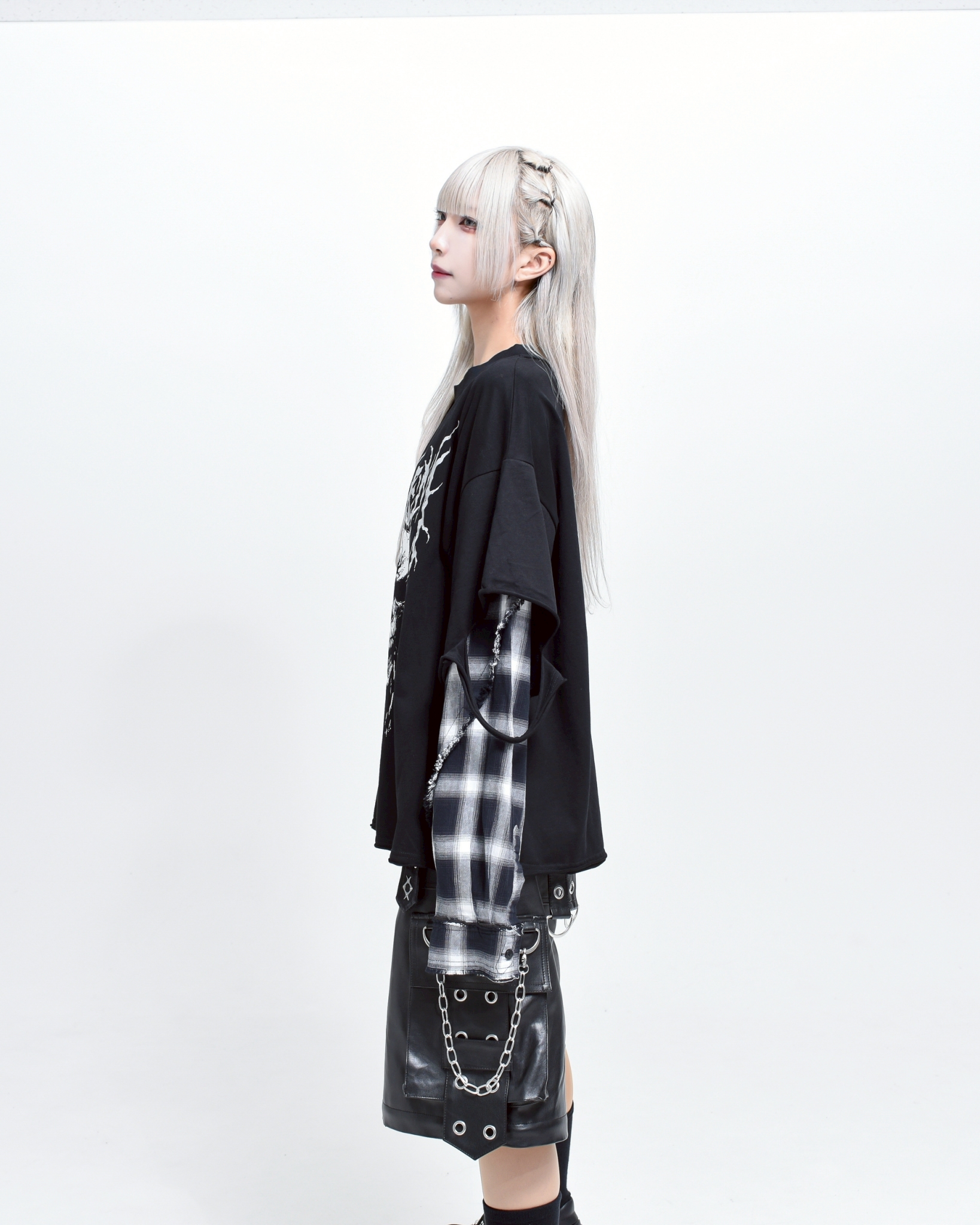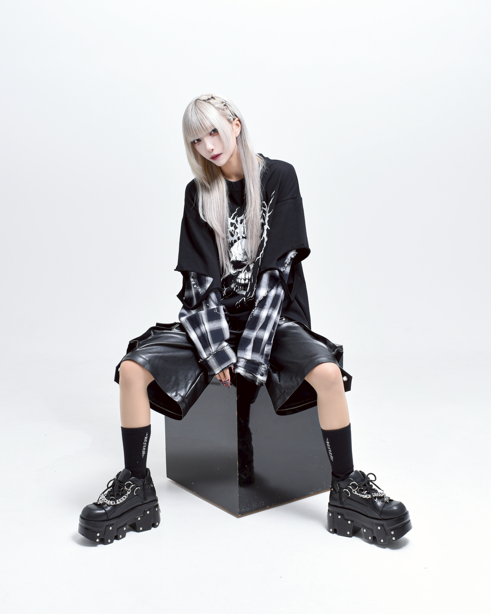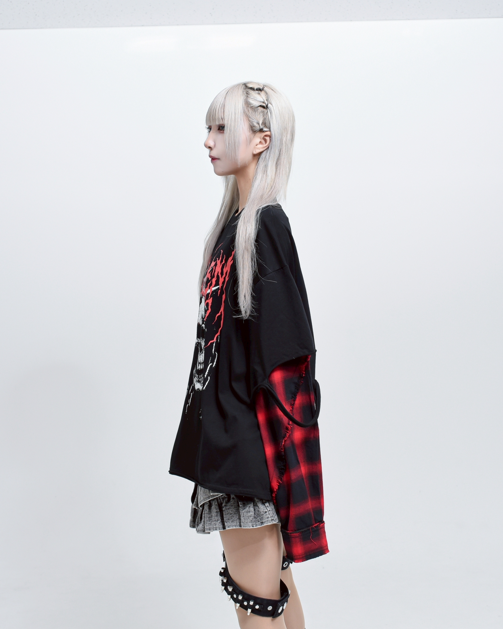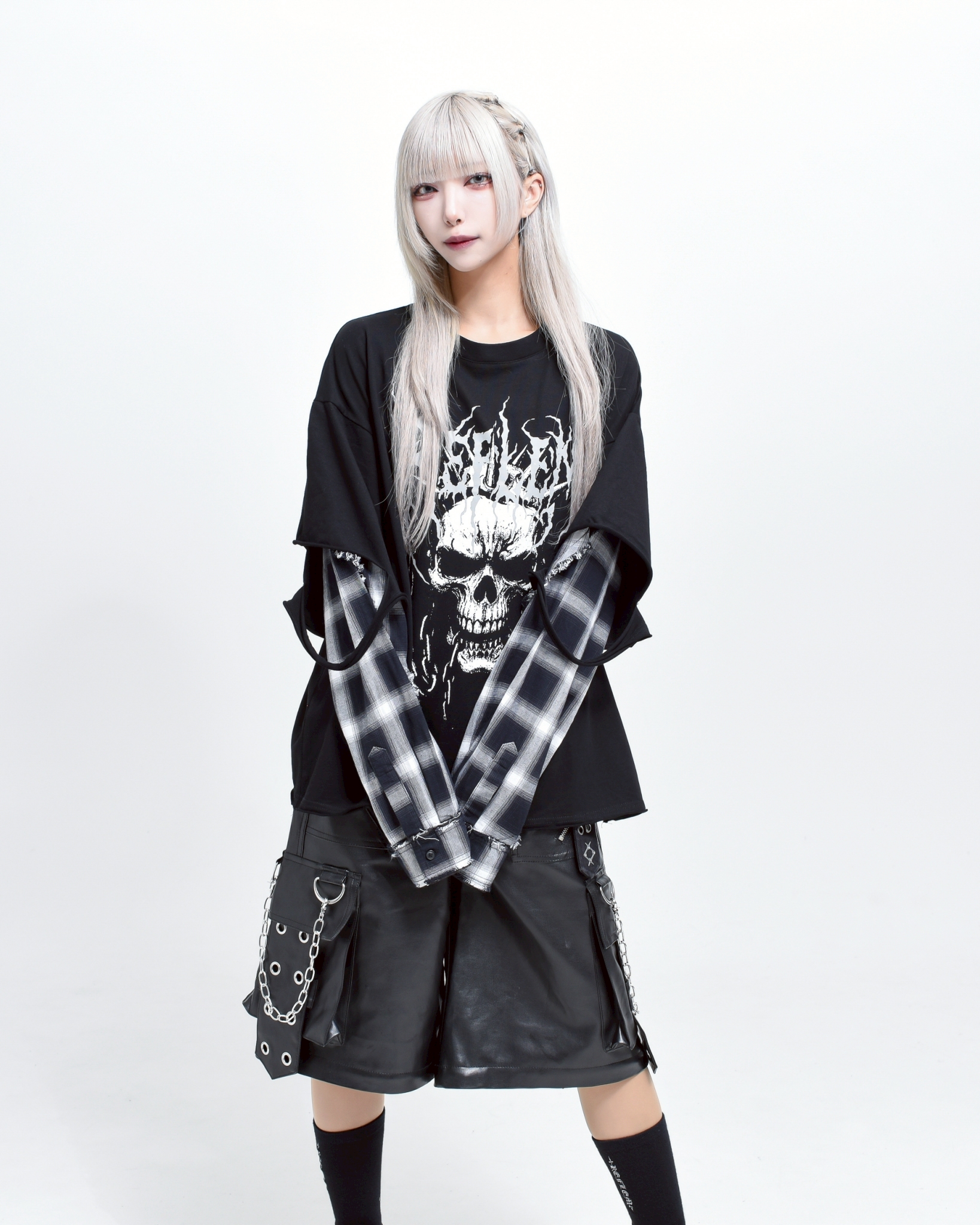 A piece that channels REFLEM’s signature dark street style, featuring a strong punk aesthetic with skull artwork and layered check patterns.