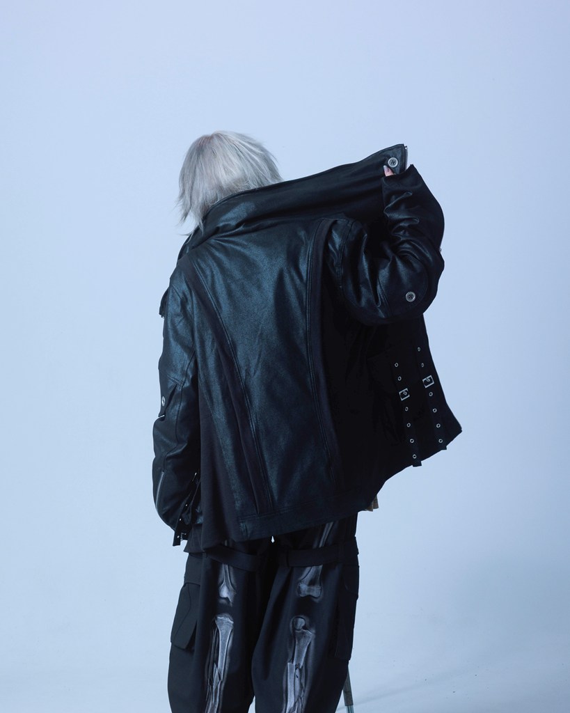 The material’s unique balance of stiffness and drape enhances its underground aesthetic.