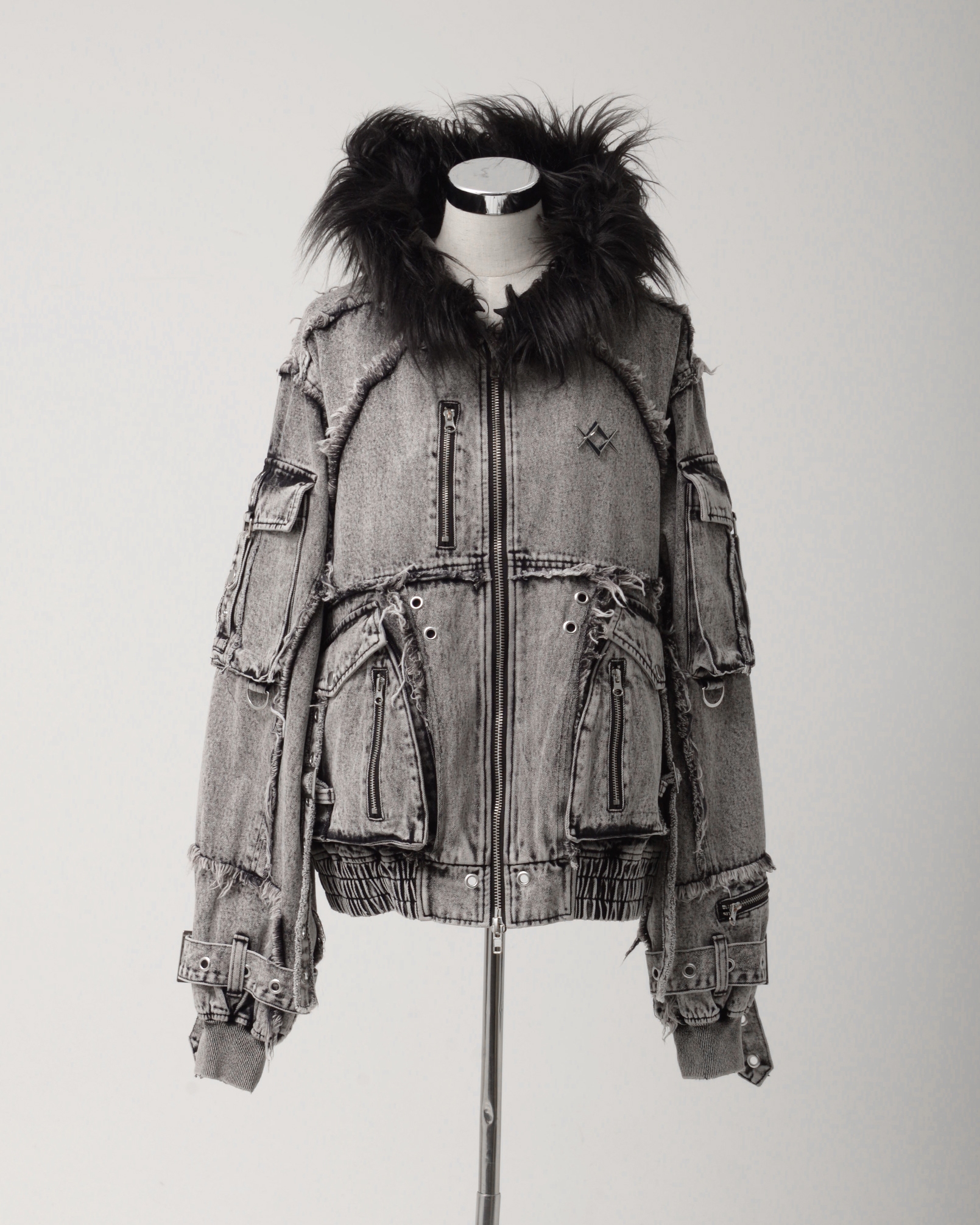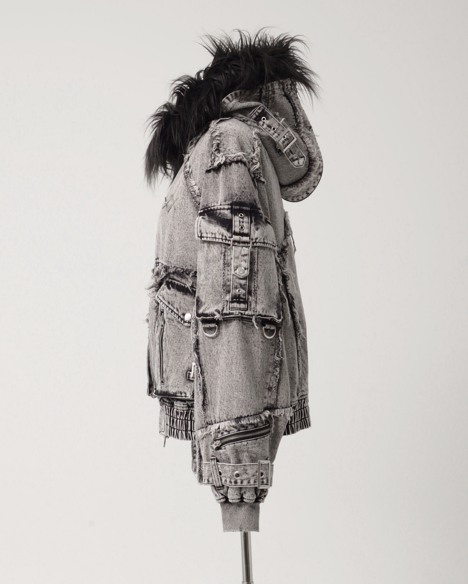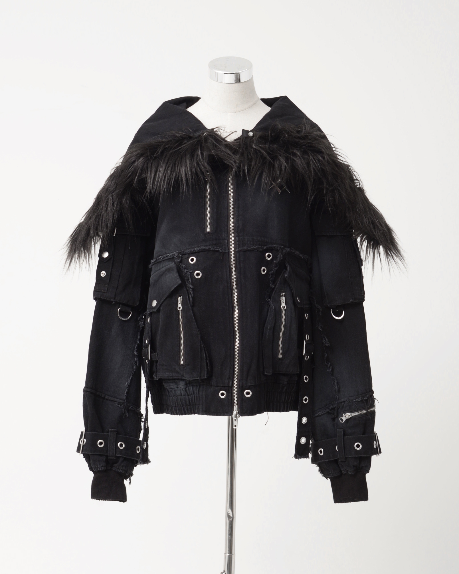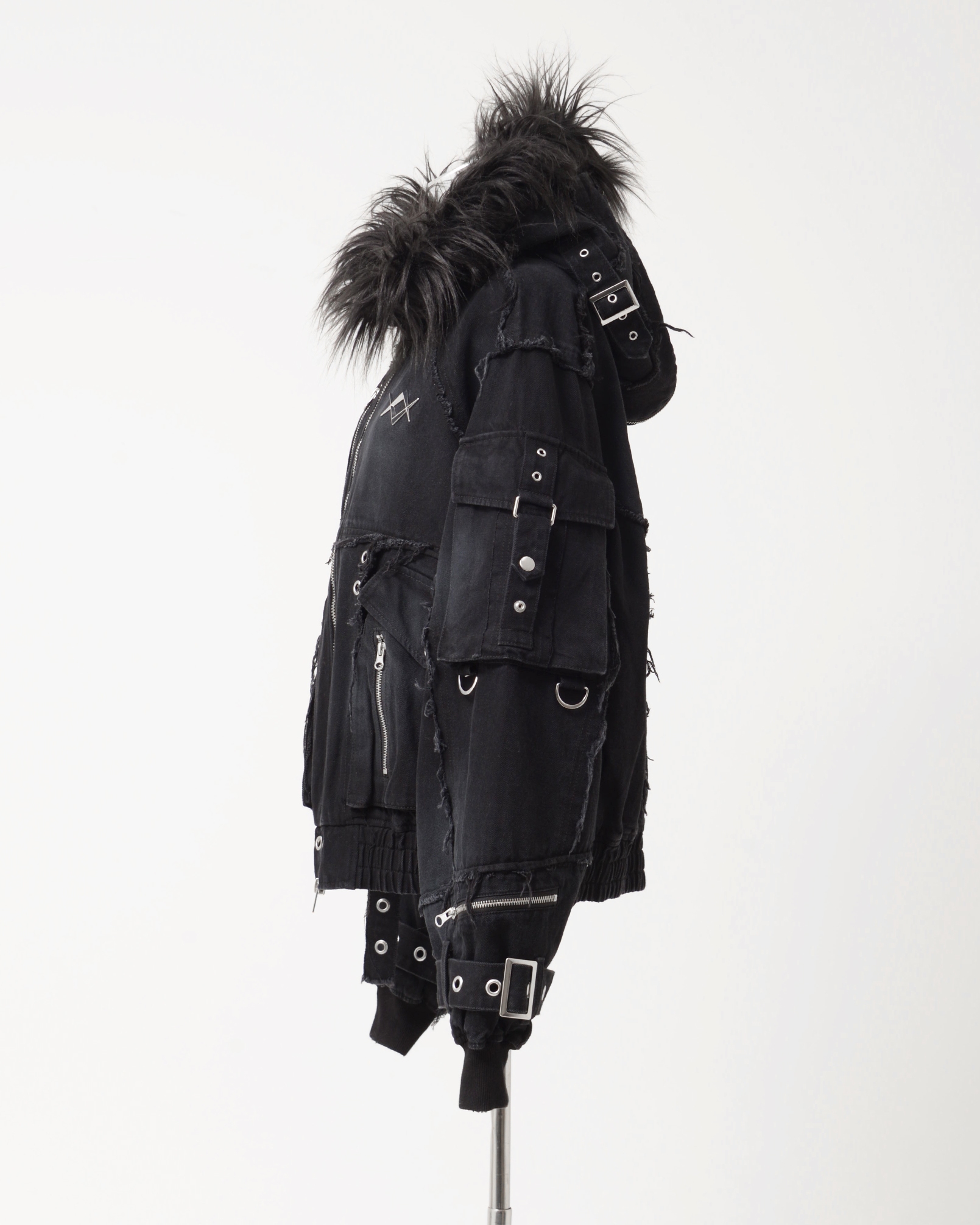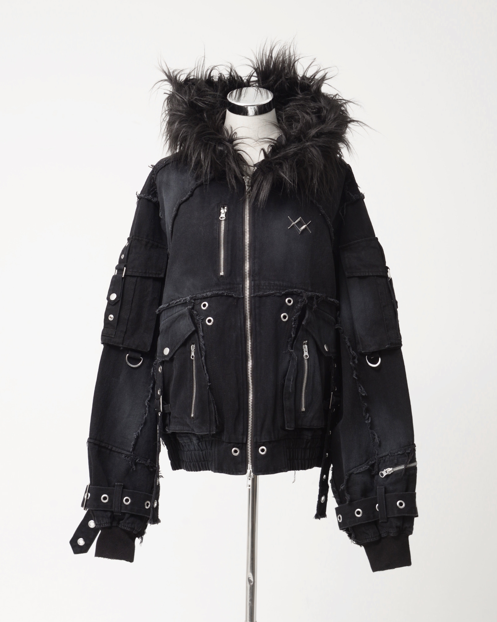A N2B jacket featuring fur accents and decorative details. This piece combines REFLEM’s signature detailing with trendy elements. Perfect for dark street styles, and also pairs well with grunge and Y2K aesthetics. The unisex silhouette adds to its versatility.