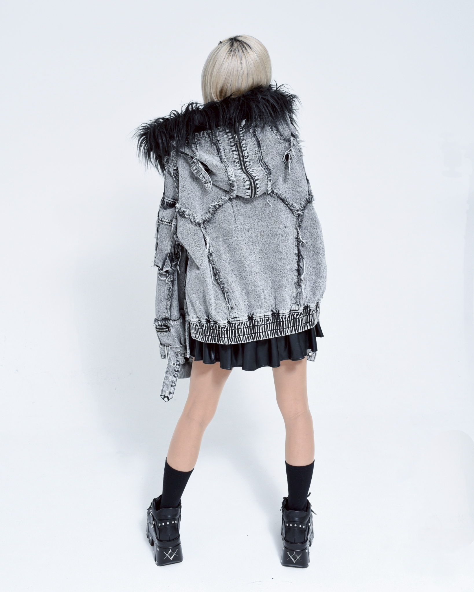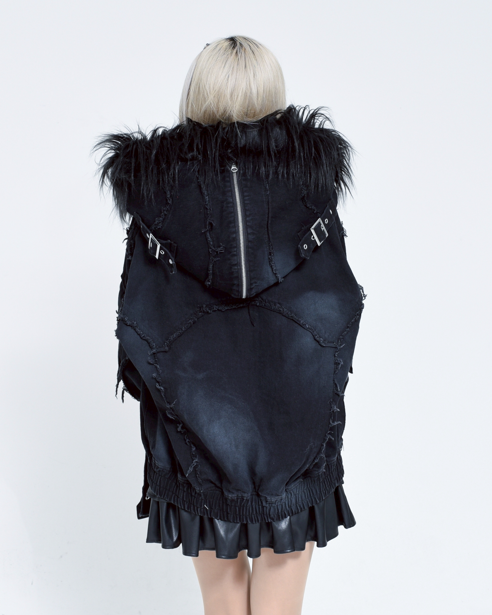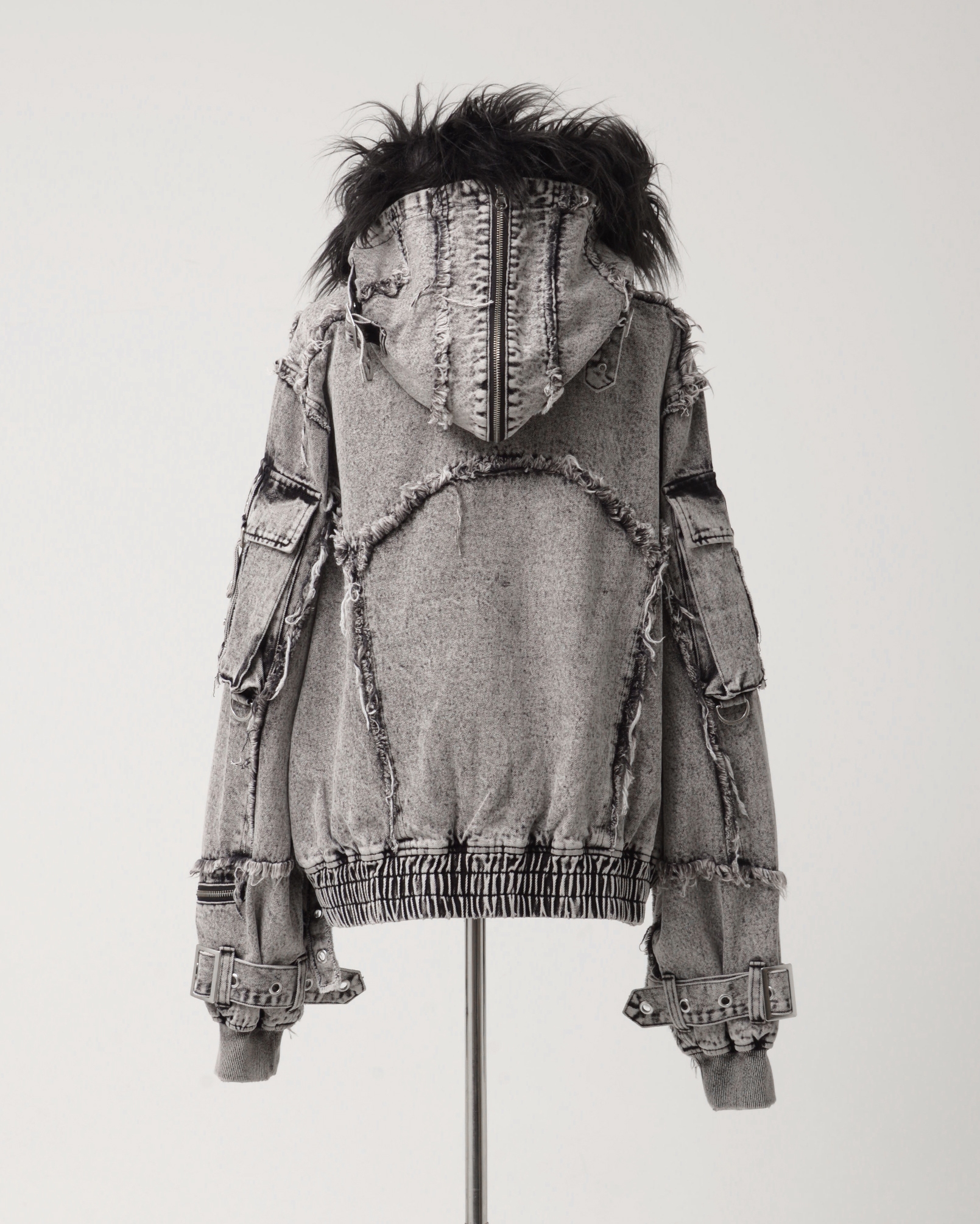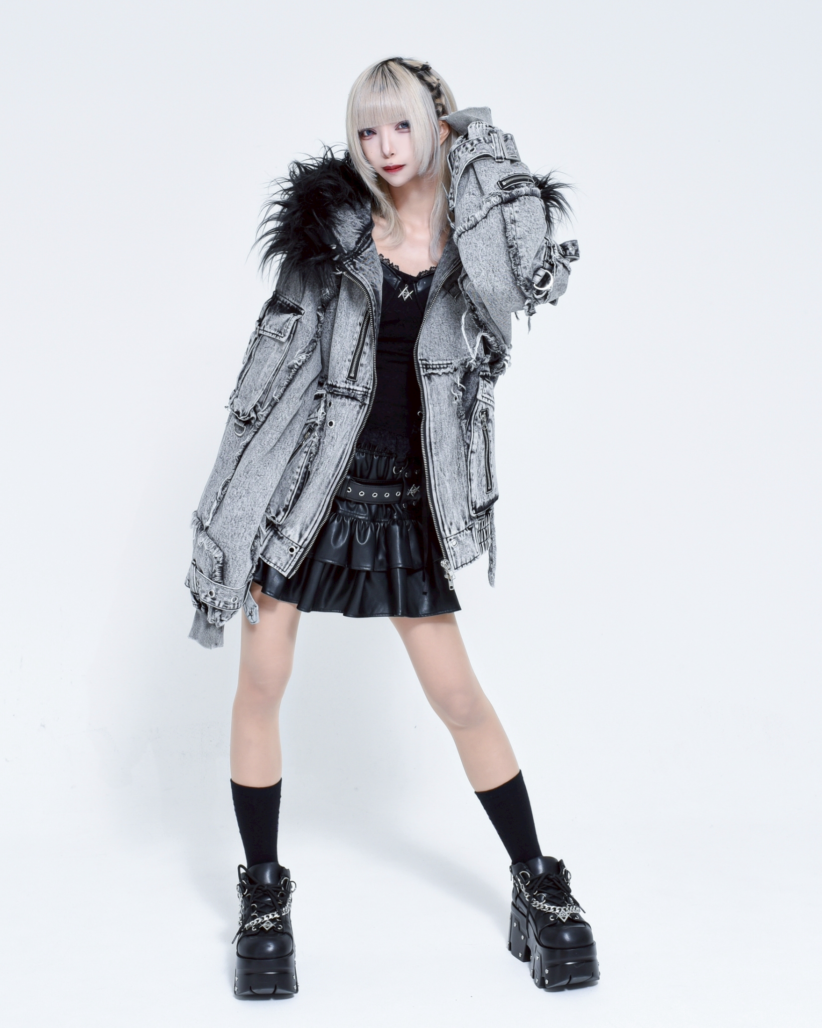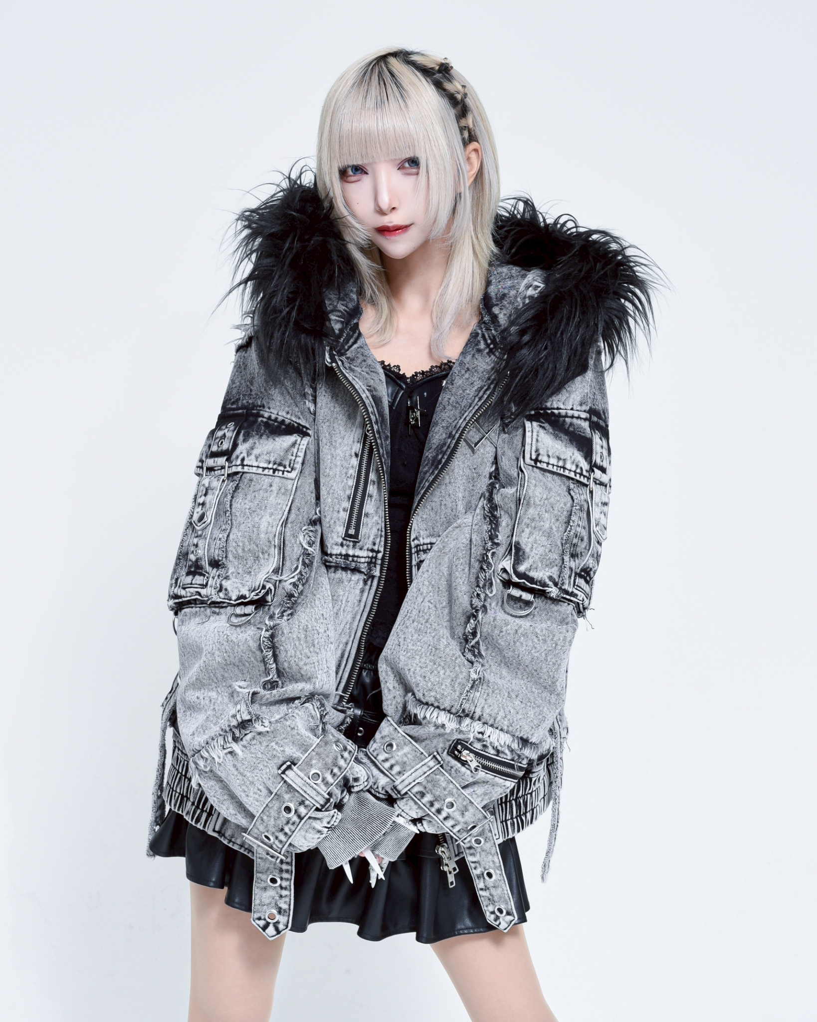 A N2B jacket featuring fur accents and decorative details. This piece combines REFLEM’s signature detailing with trendy elements. Perfect for dark street styles, and also pairs well with grunge and Y2K aesthetics. The unisex silhouette adds to its versatility.