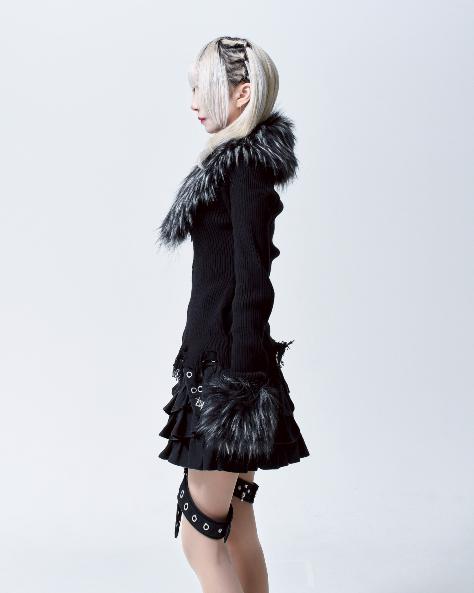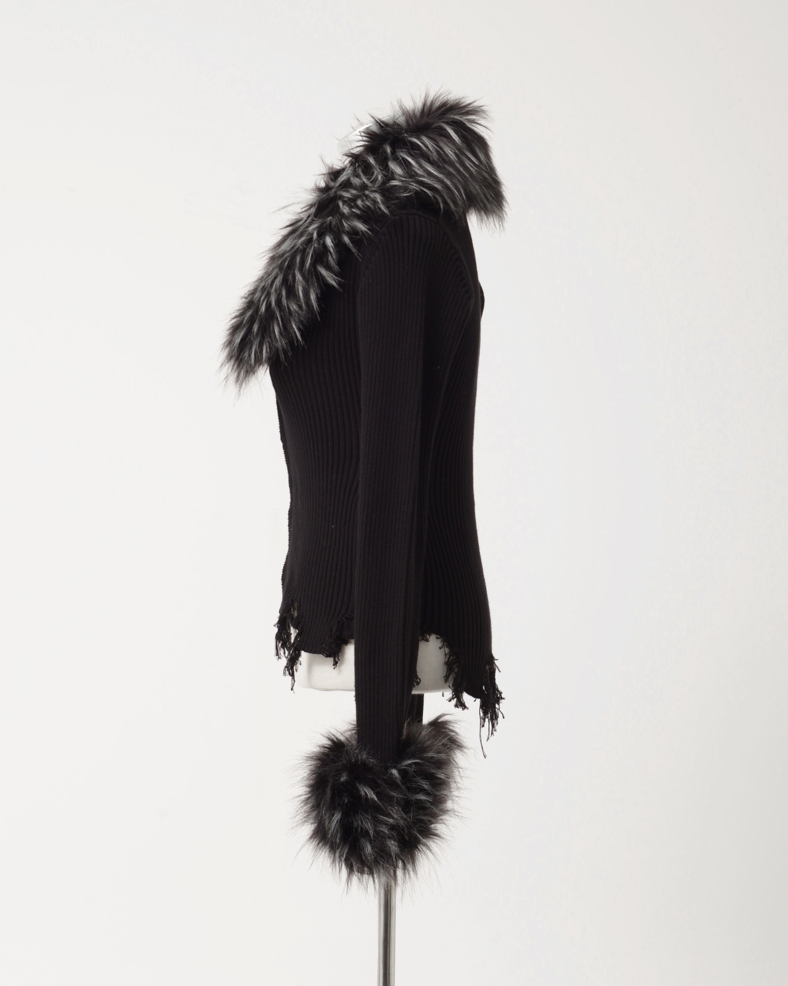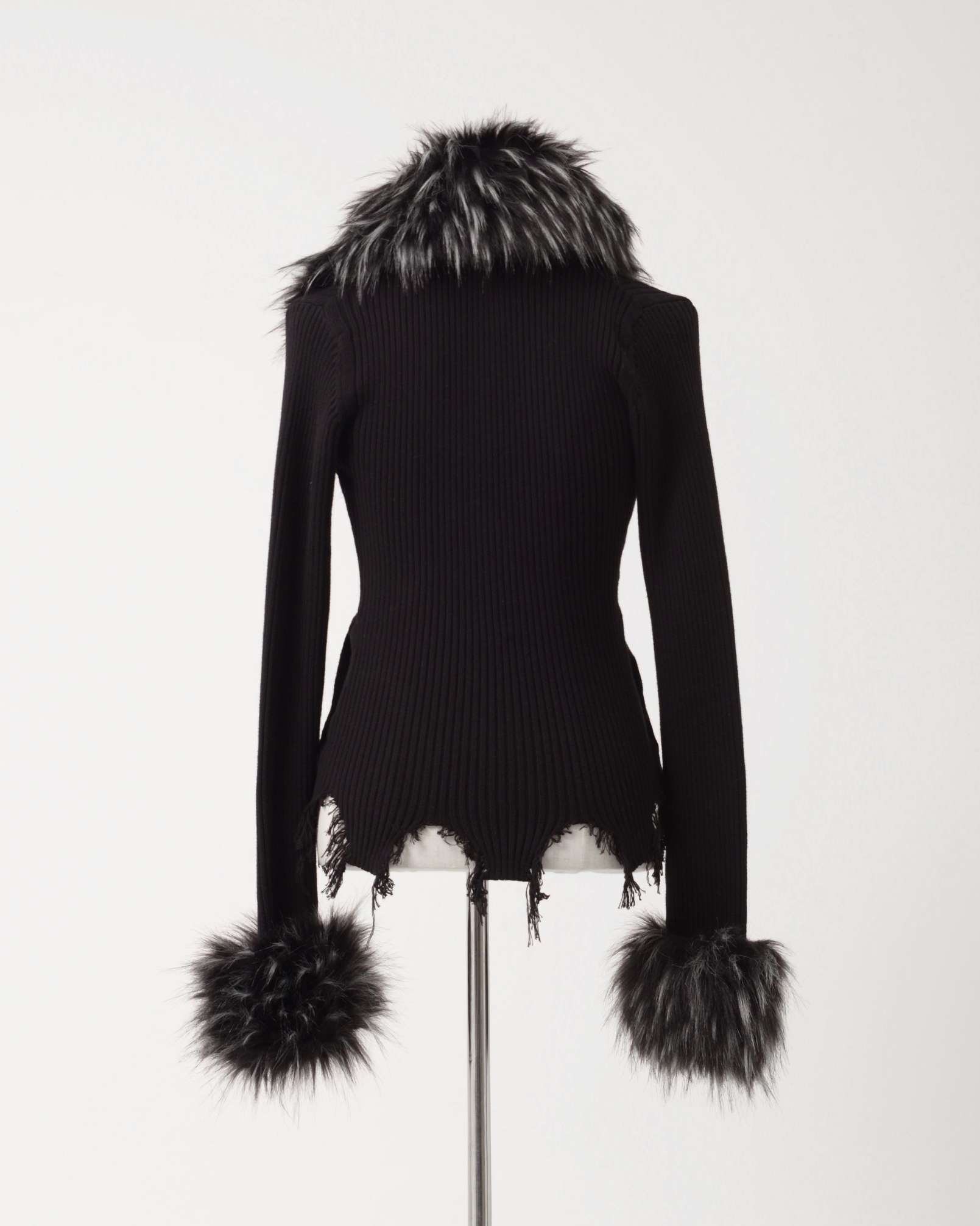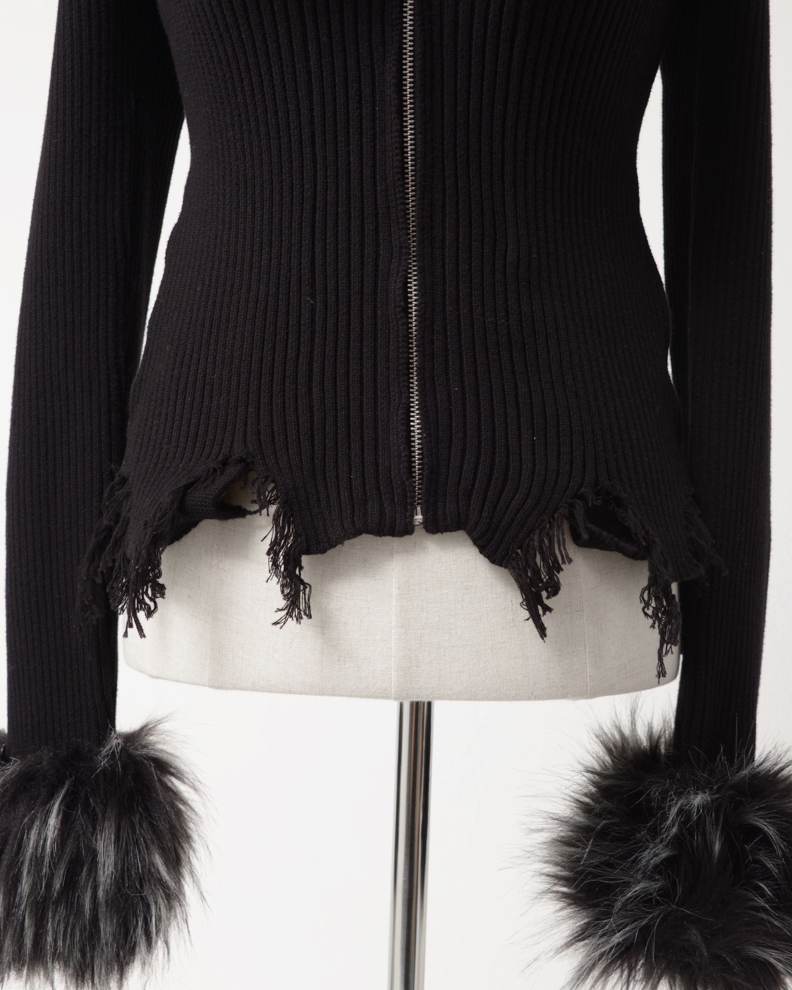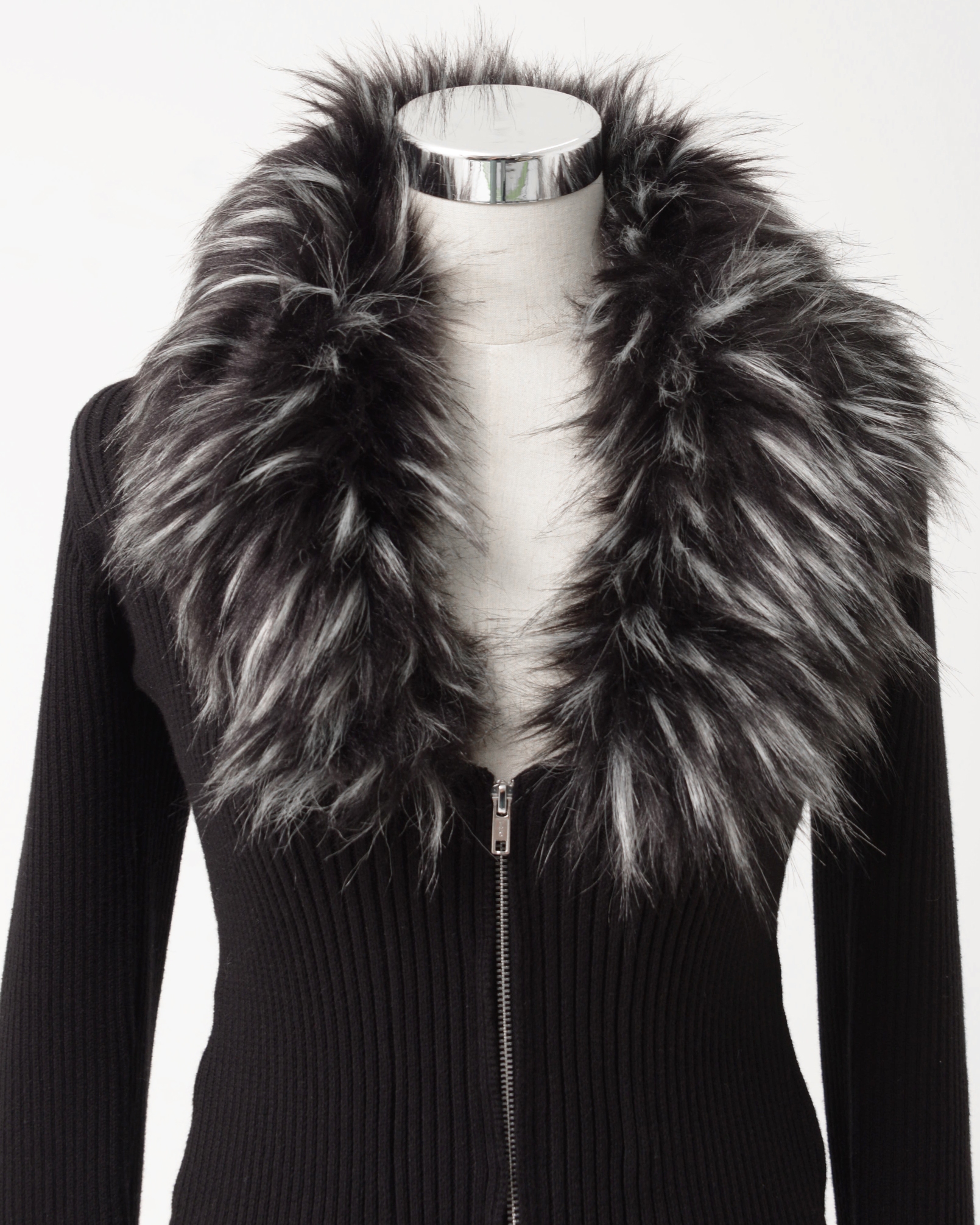 A ZIP knit cardigan featuring eye-catching fur accents on the collar and cuffs. The slim silhouette emphasizes the voluminous fur, and the knit material allows for stretch. Both the material and silhouette give this piece a trendy, fashionable vibe.